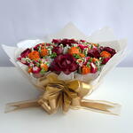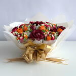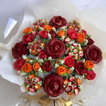Un BouqCake es un concepto único que combina la elegancia de un ramo de flores (bouquet) con la dulzura de los cupcakes. Cada BouqCake está compuesto por cupcakes decorados con diseños florales que simulan un arreglo floral, creando un regalo delicioso y visualmente impactante. Es perfecto para sorprender en cualquier ocasión, uniendo belleza y sabor en una presentación artesanal y sofisticada. Nuestra opción más impresionante, incluye 19 cupcakes florales premium. • Diseño: Rosas rojas, naranja y fucsia. • Decoración: Hecha a mano con buttercream (crema de mantequilla) americana cremosa. Sabores a elegir: vainilla, chocolate, red velvet o zanahoria. Por favor, indica en la nota a la tienda el sabor o combinación de sabores que prefieres. Cupcake Red Velvet Ingredientes: Bizcocho (67%) [azúcar, huevo pasteurizado (conservante E202, acidulante E330), mantequilla (nata, cultivos del ácido láctico, concentrado del ácido láctico, sal), harina de trigo, leche pasteurizada, cacao en polvo, vinagre de vino blanco (sulfitos), levadura química (gasificantes E500ii y E450i, harina de arroz, estabilizante E341i), extracto de vainilla (azúcar invertido, extracto de vainilla Bourbon, vainas de vainilla, espesante goma xantana), gasificante (bicarbonato sódico), colorante rojo (humectante E422, agua, colorantes E122*, E129*, E133, almidón modificado de tapioca)]; decoración [azúcar glacé (azúcar, almidón de maíz), mantequilla (nata, cultivos del ácido láctico, concentrado del ácido láctico, sal), agua, colorantes alimenticios (humectante E422, espesante E551, agua, colorantes E102*, E110*, E122*, E129*, E133, almidón modificado de tapioca)]. *E122 y E129 pueden tener efectos negativos sobre la actividad y la atención de los niños. Alérgenos: Contiene gluten, huevo, leche y sulfitos. Puede contener trazas de soja, frutos de cáscara (almendras, avellanas, nueces, anacardos, pacanas, pistachos, macadamia, nueces de Australia), sésamo y mostaza. Cupcake Vainilla Ingredientes: Bizcocho (67%) [mantequilla (nata, cultivos del ácido láctico, concentrado del ácido láctico, sal), azúcar, harina de trigo, huevo pasteurizado (conservante E202, acidulante E330), levadura química (gasificantes E500ii y E450i, harina de arroz, estabilizante E341i), extracto de vainilla (0,56%) (azúcar invertido, extracto de vainilla Bourbon, vainas de vainilla, espesante goma xantana)]; decoración [azúcar glacé (azúcar, almidón de maíz), mantequilla (nata, cultivos del ácido láctico, concentrado del ácido láctico, sal), agua, colorantes alimenticios (humectante E422, espesante E551, agua, colorantes E102*, E110*, E122*, E129*, E133, almidón modificado de tapioca)]. *E122 y E129 pueden tener efectos negativos sobre la actividad y la atención de los niños. Alérgenos: Contiene gluten, huevo y leche. Puede contener trazas de soja y mostaza. Cupcake Chocolate Ingredientes: Bizcocho (67%) [mantequilla (nata, cultivos del ácido láctico, concentrado del ácido láctico, sal), azúcar, harina de trigo, huevo pasteurizado (conservante E202, acidulante E330), cacao en polvo (5,11%), levadura química (gasificantes E500ii y E450i, harina de arroz, estabilizante E341i), agua, leche pasteurizada, extracto de vainilla (azúcar invertido, extracto de vainilla Bourbon, vainas de vainilla, espesante goma xantana), café soluble, vinagre de vino blanco (sulfitos)]; decoración [azúcar glacé (azúcar, almidón de maíz), mantequilla (nata, cultivos del ácido láctico, concentrado del ácido láctico, sal), agua, colorantes alimenticios (humectante E422, espesante E551, agua, colorantes E102*, E110*, E122*, E129*, E133, almidón modificado de tapioca)]. *E122, E110 y E129 pueden tener efectos negativos sobre la actividad y la atención de los niños. Alérgenos: Contiene gluten, huevo, leche y sulfitos. Puede contener trazas de soja, frutos de cáscara, sésamo y mostaza. Cupcake Zanahoria Ingredientes: Bizcocho (67%) [zanahoria (18,41%), harina de trigo, huevo pasteurizado (conservante E202, acidulante E330), azúcar, aceite refinado de girasol, leche pasteurizada, levadura química (gasificantes E500ii y E450i, harina de arroz, estabilizante E341i), ralladura de naranja, ralladura de limón, canela y extracto de vainilla (azúcar invertido, extracto de vainilla Bourbon, vainas de vainilla, espesante goma xantana)]; decoración [azúcar glacé (azúcar, almidón de maíz), mantequilla (nata, cultivos del ácido láctico, concentrado del ácido láctico, sal), agua, colorantes alimenticios (humectante E422, espesante E551, agua, colorantes E102*, E110*, E122*, E129*, E133, almidón modificado de tapioca)]. *E122 y E129 pueden tener efectos negativos sobre la actividad y la atención de los niños. Alérgenos: Contiene gluten, huevo y leche. Puede contener trazas de soja y mostaza.