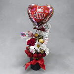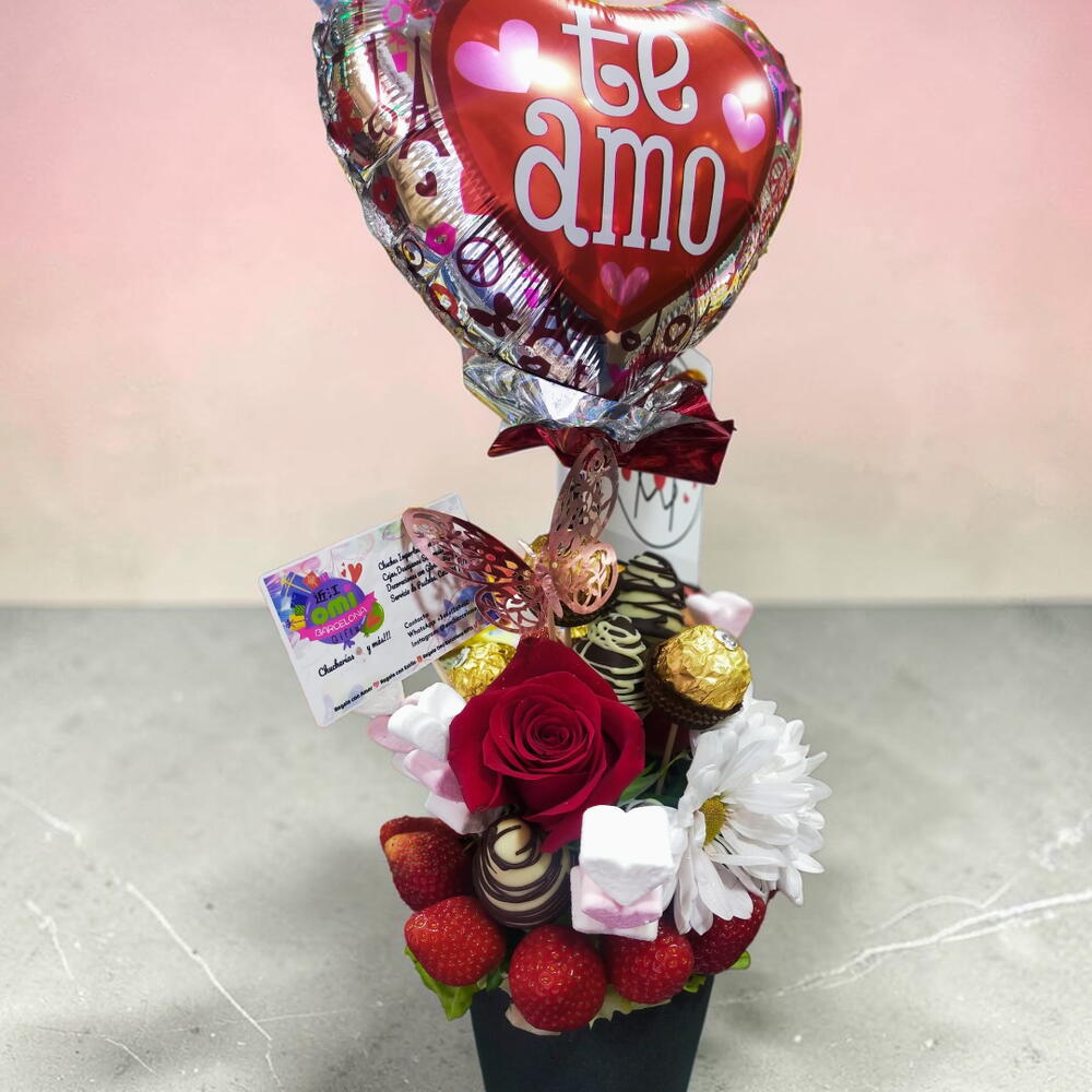 follaje verde - 1 ud. rosa roja - 1 ud. margaritas blancas multi tallo - 1 ud. lazo de cinta - 1 ud. mariposa decorativa - 1 ud. tarjeta dedicatoria - 1 ud. bombón ferrero rocher - 4 ud. globo 10" - 1 ud. fresa bañada en chocolate - 6 ud. fresa fresca - 300 gr malvavisco (forma corazón o flor) - 3 ud. base de cerámica (color negro o blanco según disponibilidad) - 1 ud.