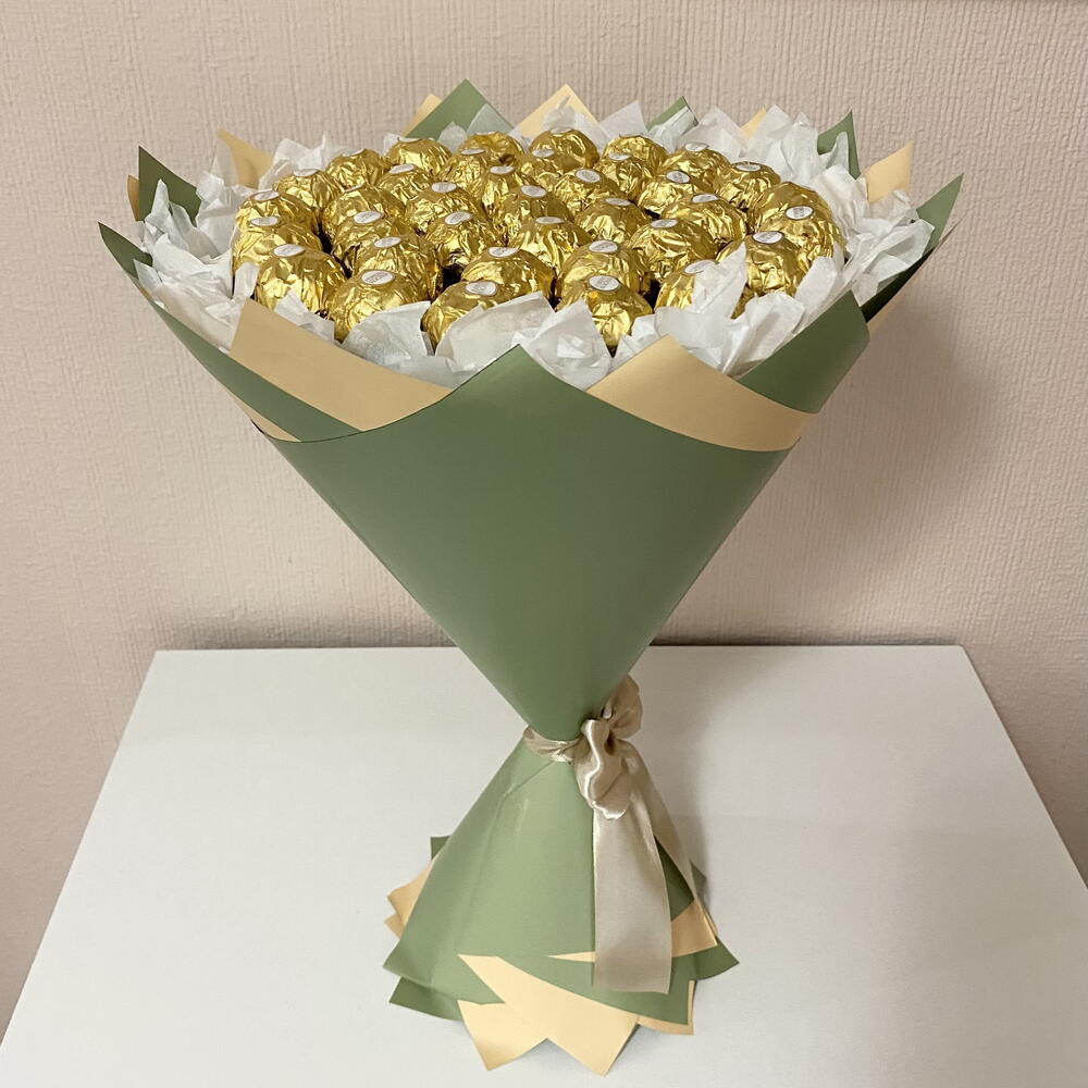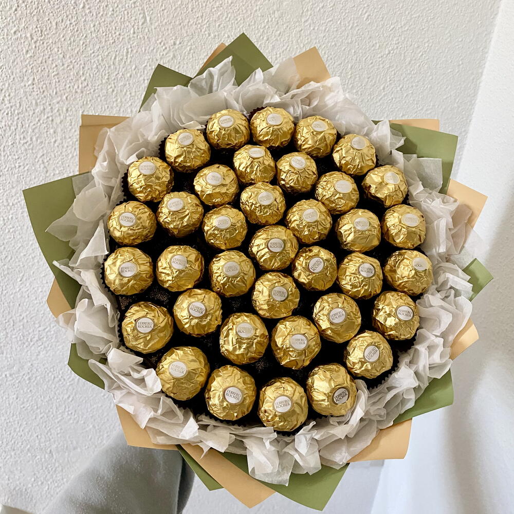 Un regalo elegante y llamativo para los amantes del chocolate. 🍫✨ Este hermoso ramo está hecho con 37 piezas de Ferrero Rocher, cuidadosamente dispuestas a mano. El ramo contiene casi 700 g de chocolate, por lo que no solo es impresionante, sino también un regalo realmente generoso y delicioso. Con un diámetro de 30 cm, este ramo de chocolates es perfecto para cumpleaños, aniversarios, celebraciones, sorpresas románticas o regalos de agradecimiento. Una sorpresa lujosa y dulce que sin duda traerá alegría y sonrisas.