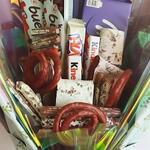 Kinder bueno - 3 ud. Kinder chocolate - 2 ud. Milka - 2 ud. fuet curado - 5 ud. chorizo mini - 4 ud.
