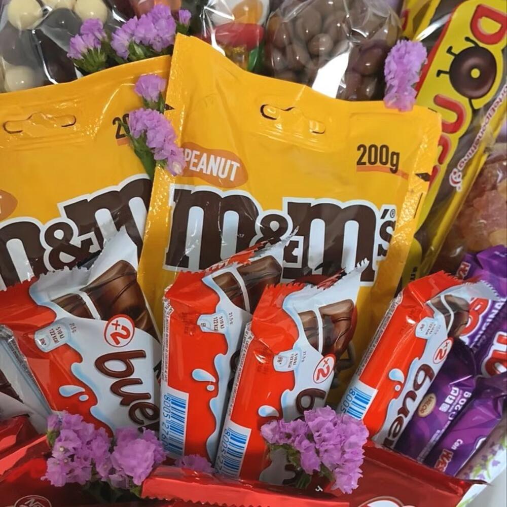 Este espectacular ramo de chocolates y golosinas es una forma original y divertida de regalar dulzura. Combinamos tus marcas favoritas como KitKat, Kinder Bueno, MM’s, chocolate Huesitos, Donettes y chuches variadas, todo cuidadosamente dispuesto en un envoltorio decorativo con tonos lilas y flores secas. Es un detalle perfecto para cumpleaños, celebraciones escolares, agradecimientos o simplemente para alegrar el día. ¡Una explosión de sabor y color que encantará tanto a peques como a adultos! Conservar en un lugar fresco y seco. Evitar exposición directa al sol o al calor para mantener la calidad de los dulces. Consumir preferentemente antes de la fecha indicada en los productos.