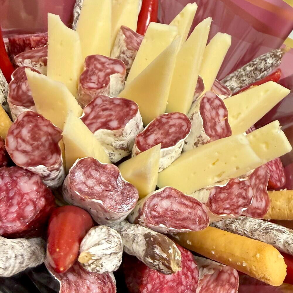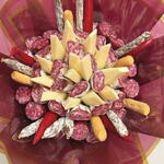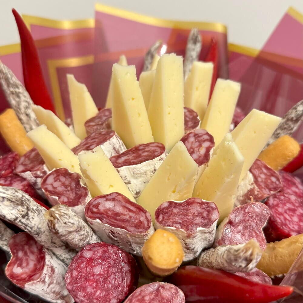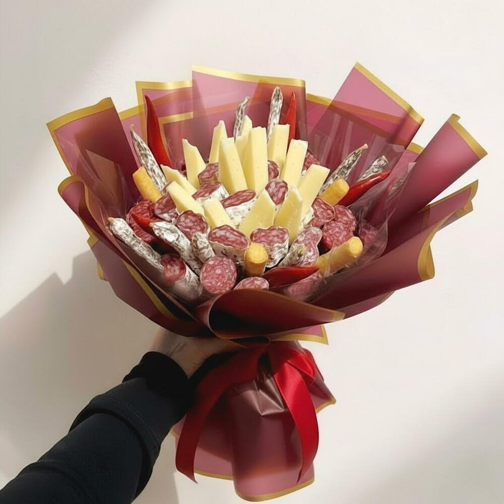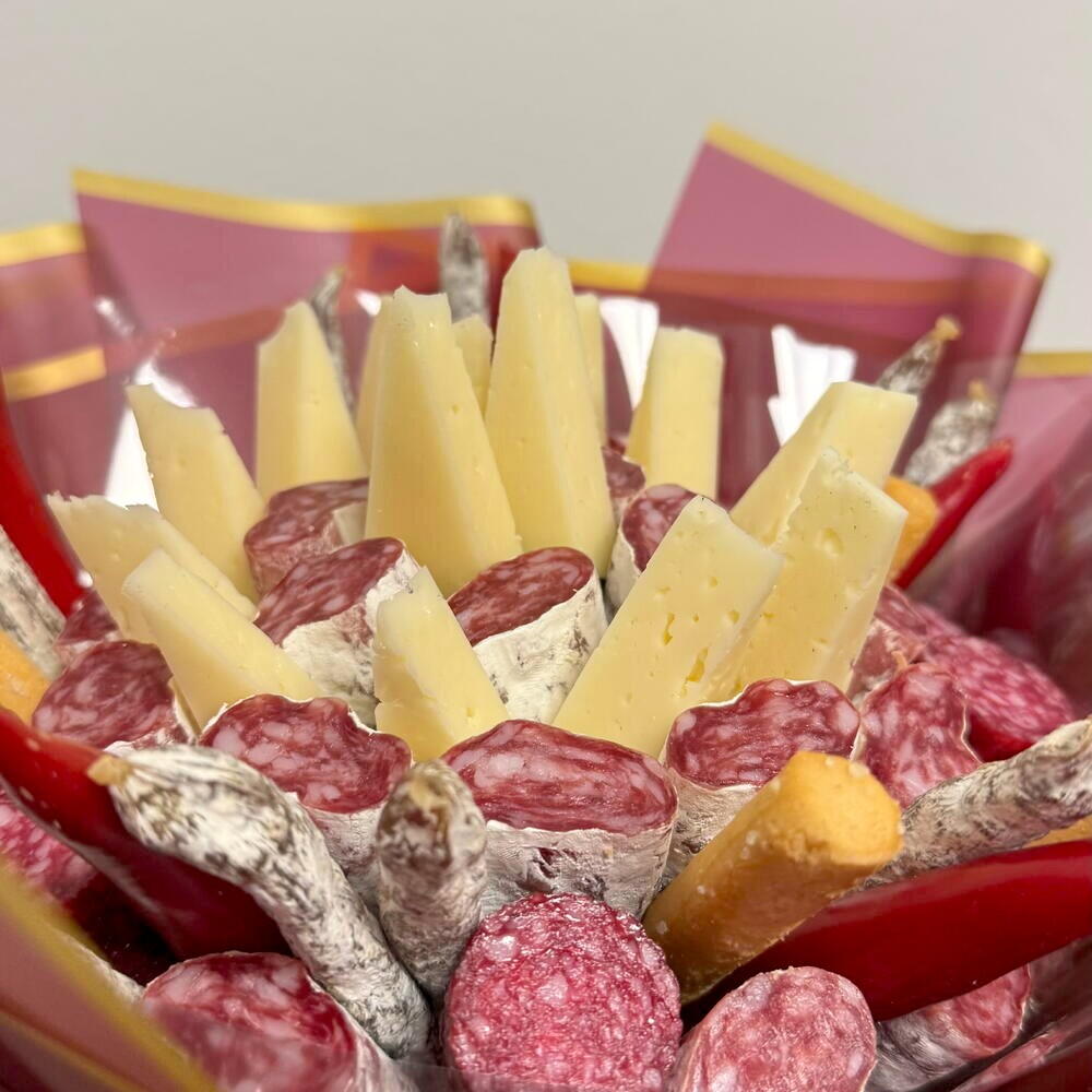 Ramo gourmet original que combina quesos seleccionados, fuet y detalles especiales en una presentación elegante y moderna. Una alternativa creativa al clásico ramo de flores, ideal como regalo romántico para sorprender a la novia, al novio, a la esposa o al esposo en una ocasión especial. Este bouquet comestible es perfecto para pareja que desea celebrar el amor de una forma diferente, con un detalle exclusivo y lleno de sabor. Muy buscado como regalo tanto para hombre como para mujer, es una opción sofisticada y memorable para expresar cariño y complicidad.