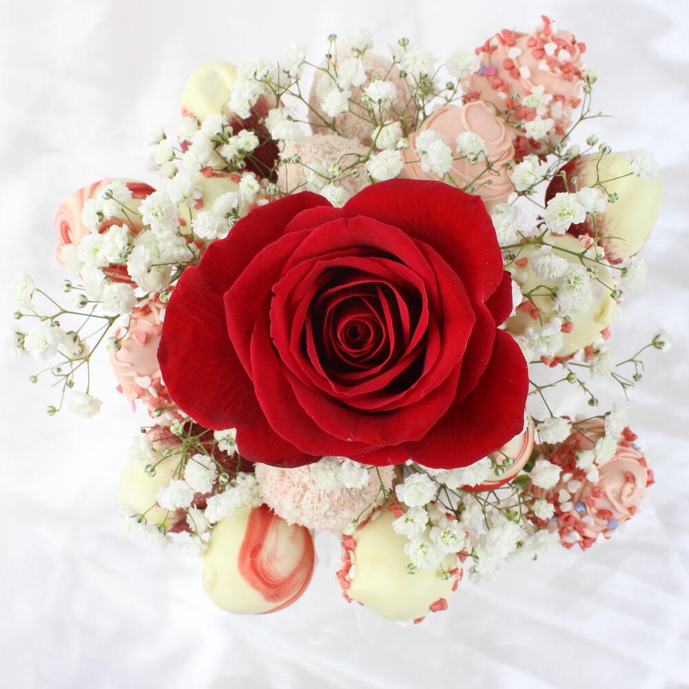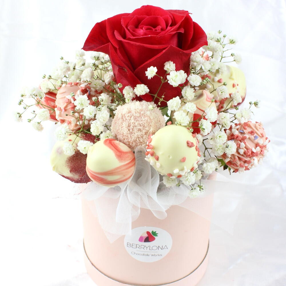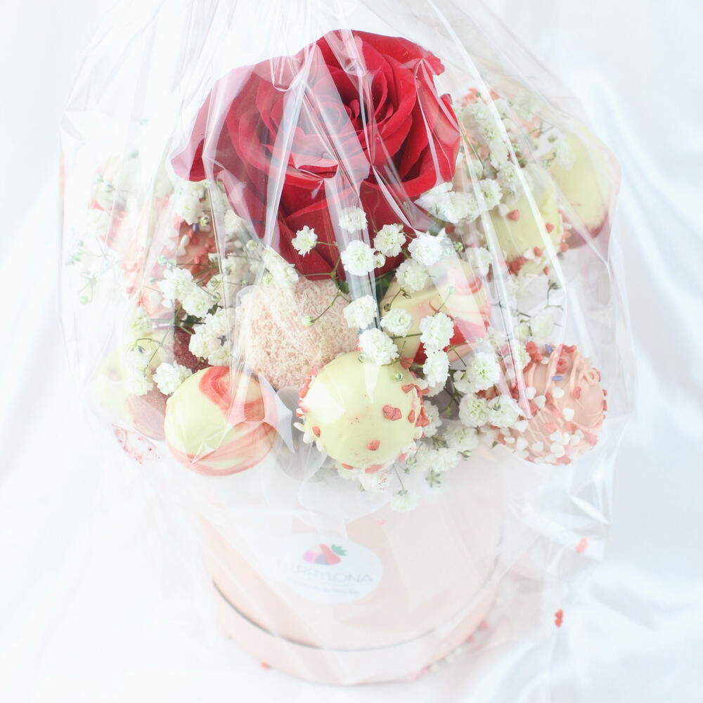 Gypsophila - 1 ud. chocolate blanco - 15 ud. rosa roja - 1 ud. fresas con chocolate - 15 ud.