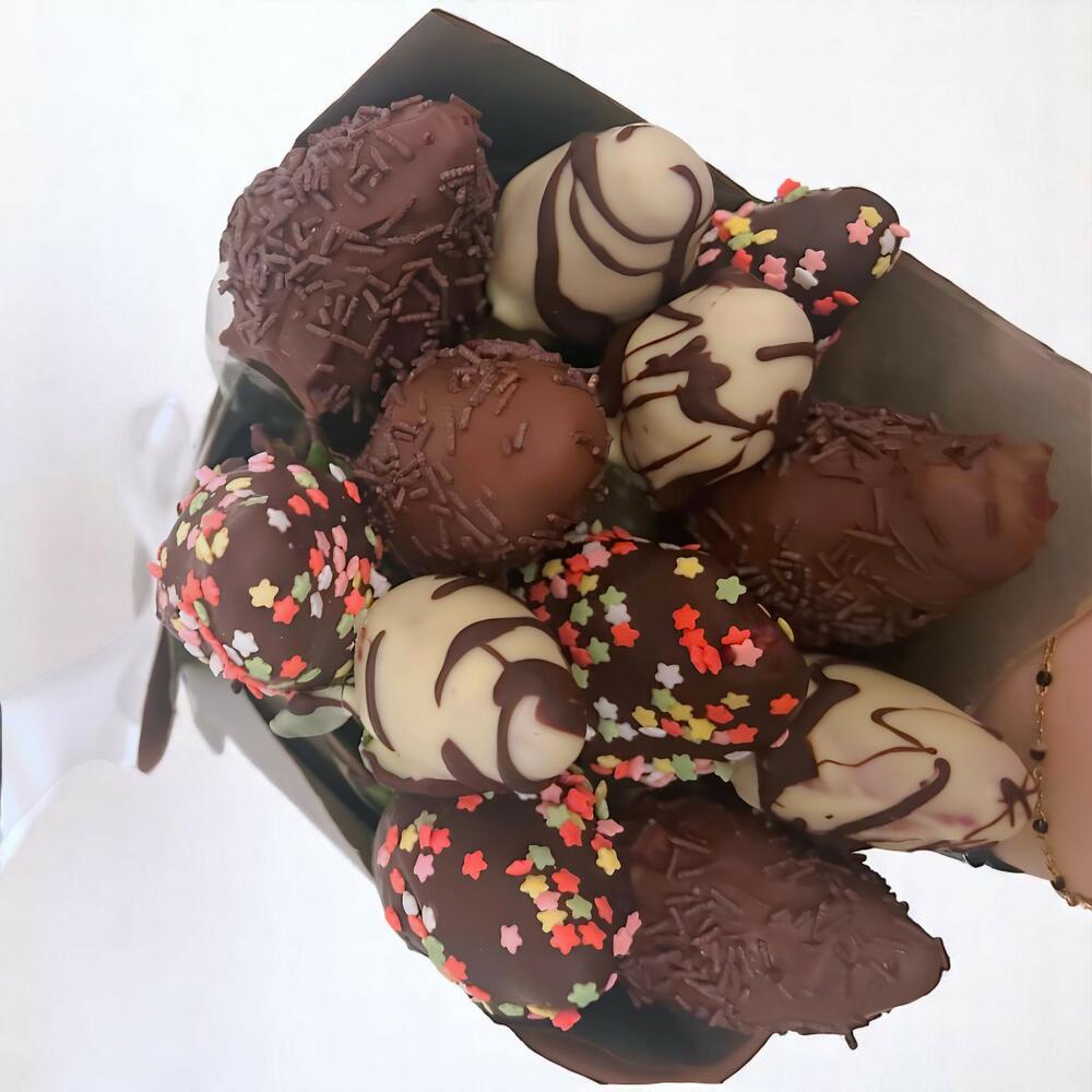 fresas frescas bañadas en chocolate negro - 4 ud. fresas frescas bañadas en chocolate blanco - 4 ud. fresas decoradas con chispas de colores - 4 ud.