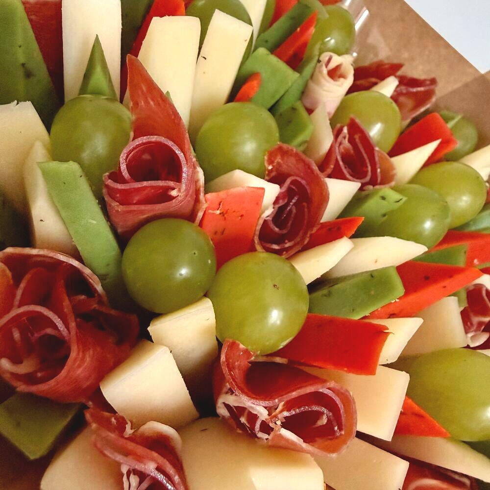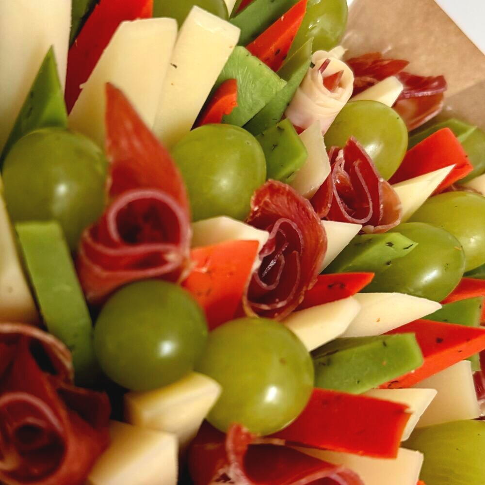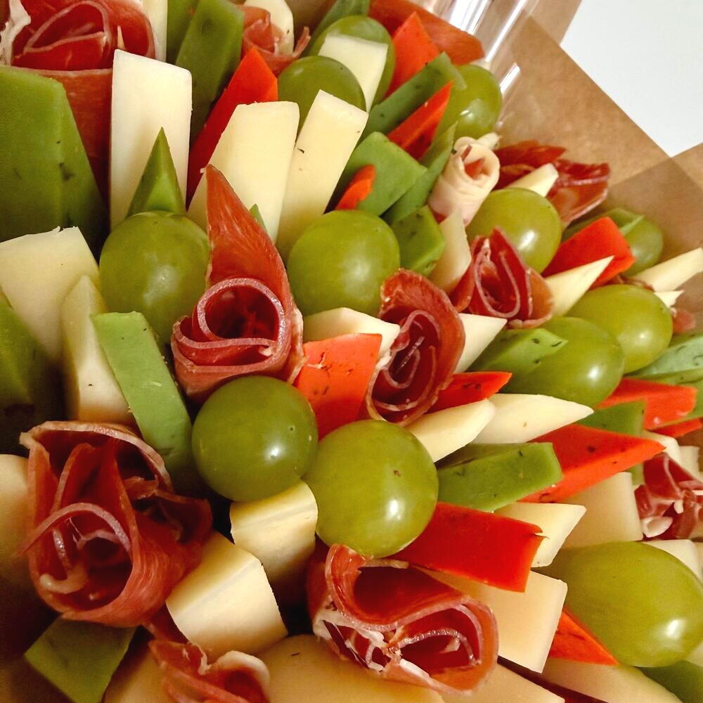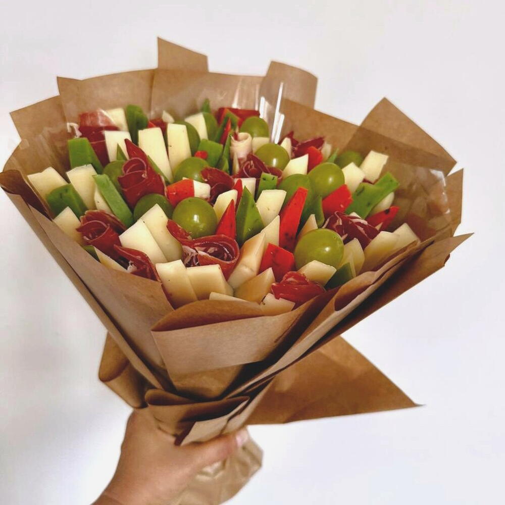 Presentamos un exclusivo ramo, elaborado con un gusto exquisito. Su base está compuesta por un delicado jamón serrano español de 200 gramos. El ramo se complementa con cuatro aromáticos quesos: un queso semicurado de 400 gramos y dos variedades de gouda holandés con pesto —verde y rojo— de 200 gramos cada uno. El toque final de este ramo son refinadas uvas verdes, con un peso de 200 gramos. Este ramo será un regalo perfecto que resaltará el gusto único de su propietario.