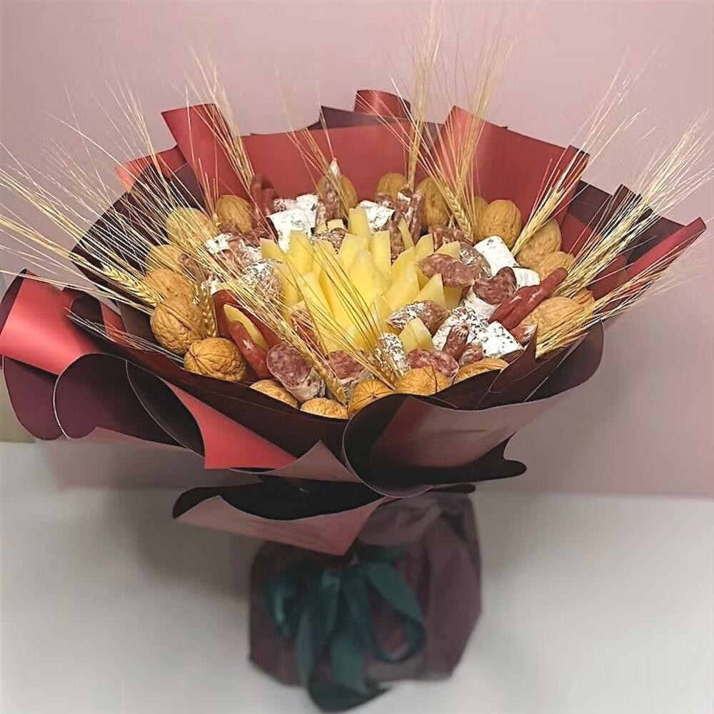 Este ramo gourmet combina la calidez rústica con el sabor intenso de los mejores productos curados. Un regalo elegante y sabroso que incluye queso curado, fuet cortado en rodajas, nueces crujientes y espigas secas decorativas que le dan un toque campestre y distinguido. Ideal para sorprender a alguien especial o para centros de mesa en celebraciones. Conservar en lugar fresco y seco, lejos del sol directo. Consumir productos curados y queso preferiblemente dentro de los primeros 3 días.