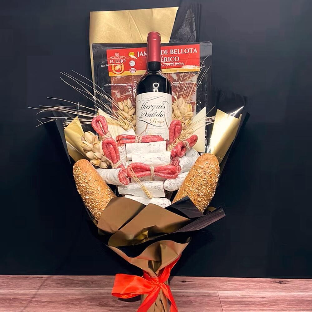 Un regalo excepcional para quienes saben apreciar los sabores intensos y auténticos. Este ramo combina la exquisitez del Jamón de Bellota 100% Ibérico con el inconfundible sabor del fuet curado y queso viejo. El toque crujiente lo aportan las flores de pistachos, acompañadas de pan artesanal con semillas, todo armonizado con una botella de vino tinto Gran Reserva D.O.Ca Rioja Marqués de Valido. Una presentación elegante y sofisticada, perfecta para celebraciones especiales, aniversarios o como un gesto inolvidable. Conservar en lugar fresco y seco. Consumir los productos curados y el queso en un plazo de 3–5 días para garantizar su frescura. El pan es mejor disfrutarlo el mismo día. Servir el vino a temperatura ambiente.