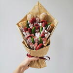 Un ramo salado único y lleno de carácter, perfecto para sorprender a los amantes de los sabores intensos. Elaborado con panecillos artesanales, fuets enteros, snacks de fuet y fuet fino, acompañado de pimientos verdes frescos para aportar color y un toque picante. Todo está cuidadosamente dispuesto y envuelto en papel decorativo estilo periódico, con un lazo rojo que le da un acabado rústico y elegante. Ideal para celebraciones, reuniones o como regalo gourmet original. Se recomienda conservar los embutidos en refrigeración y el pan en un lugar fresco y seco hasta su consumo. Una presentación irresistible que combina tradición y sabor.