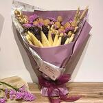 Un elegante ramo gourmet que combina sabor y estética en una sola pieza. Elaborado con dos tipos de queso curado en cuñas, frutos secos variados (nueces, pistachos y maní con cáscara), dátiles jugosos y delicadas flores secas en tonos lilas. La composición está cuidadosamente dispuesta para lograr un equilibrio visual y gustativo, envuelta en papel floral y lila, rematada con un lazo burdeos que aporta un toque sofisticado. Perfecto para regalar en ocasiones especiales como aniversarios, cumpleaños o celebraciones gourmet. Se recomienda conservar el queso en refrigeración y almacenar los frutos secos y dátiles en un lugar fresco y seco hasta su consumo. Un detalle que deleita todos los sentidos.