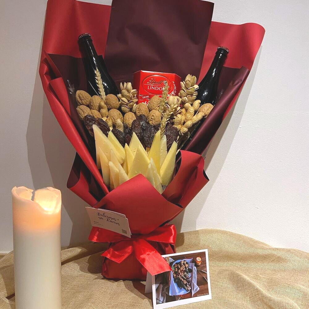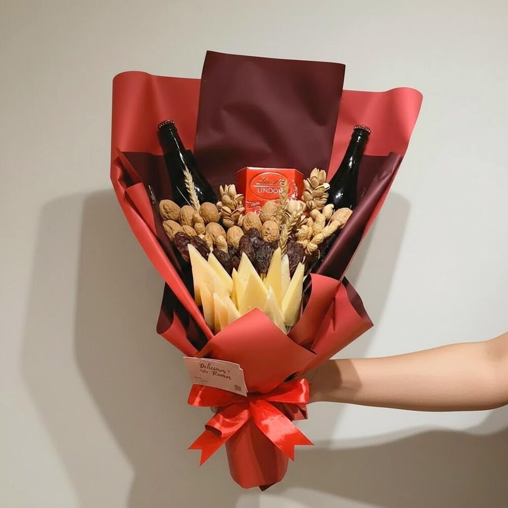Un ramo gourmet único y elegante, perfecto para sorprender con un detalle original y delicioso. Está compuesto por finas cuñas de queso curado, frutos secos (nueces y maní con cáscara), dátiles, dos botellas de sidra artesanal y una caja de bombones Lindt Lindor. Decorado con espigas de trigo y envuelto en un elegante papel burdeos con lazo rojo, combina perfectamente lo rústico con lo sofisticado. Ideal para celebraciones, aniversarios o como regalo para amantes de la buena mesa. Se recomienda conservar el queso en refrigeración hasta su consumo y mantener la sidra en un lugar fresco. Una propuesta que mezcla sabor, textura y presentación impecable.