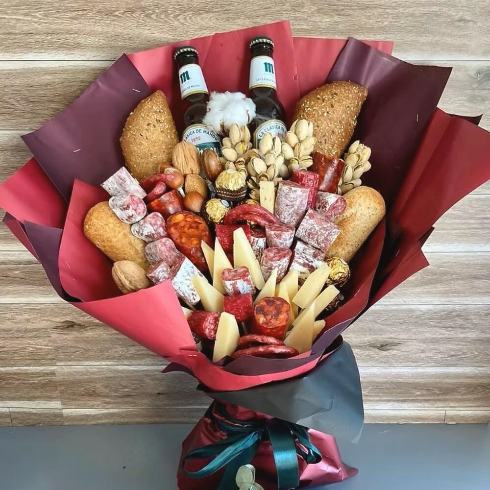 Un ramo gourmet con alma festiva que hará las delicias de cualquier amante del picoteo. Compuesto por embutidos variados (fuet, chorizo, salchichón), queso curado, panes artesanos, frutos secos y un toque dulce con bombones de chocolate. Para rematar, dos botellas de cerveza Mahou añaden el toque perfecto para un brindis inolvidable. Conservar en lugar fresco, evitar luz directa del sol. Se recomienda consumir embutidos y queso en un plazo de 2-3 días para disfrutar de su frescura.