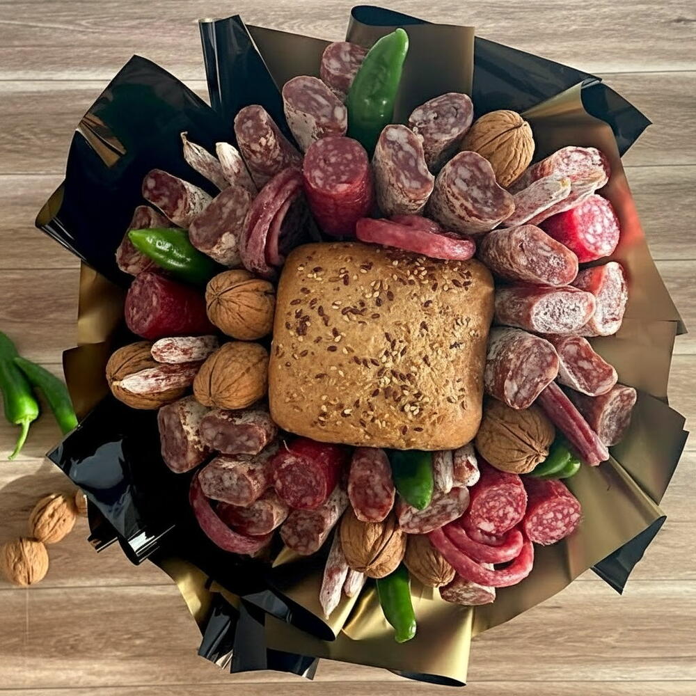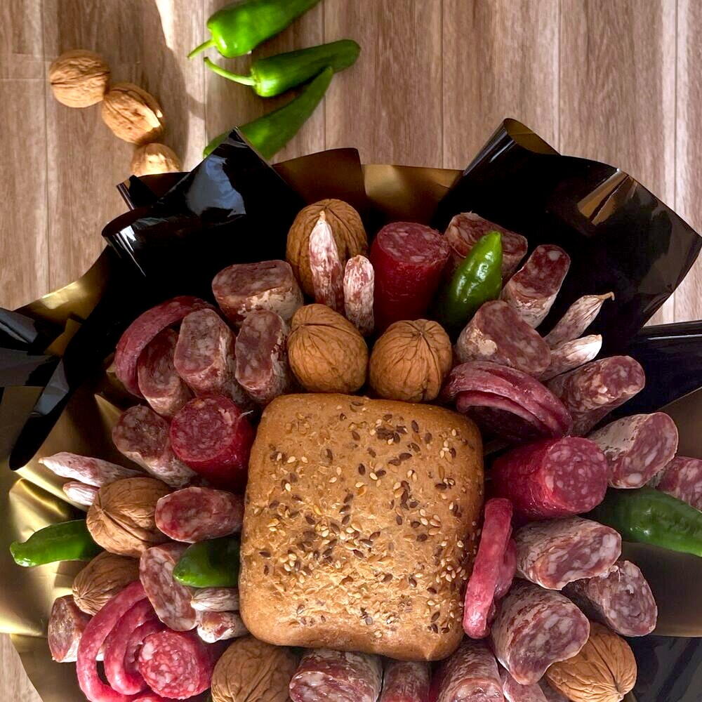 Este ramo salado es el detalle ideal para quienes disfrutan de un regalo diferente y delicioso. Elaborado con una cuidada selección de fuets tradicionales, fuet fino, pan rústico con semillas y pimiento verde fresco, cada elemento aporta su sabor único y complementa a la perfección la experiencia gourmet. Además, incluye un paquete de snacks de fuet para picar cómodamente en cualquier momento. Su estética llamativa y natural lo convierte en un regalo perfecto para celebraciones o simplemente para disfrutar de un capricho sabroso. Mantener en lugar fresco y seco. Consumir embutidos y pan en los primeros 3 días para asegurar su frescura.