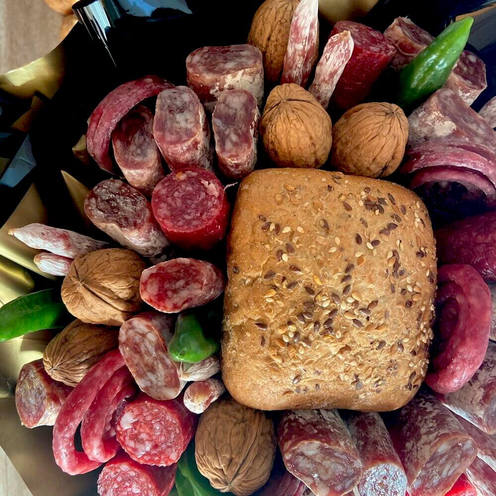 pan rústico con semillas - 1 ud. fuets tradicionales - 5 ud. snack de fuet - 100 gr pimiento verde - 6 ud. cañitas de jamón - 4 ud.