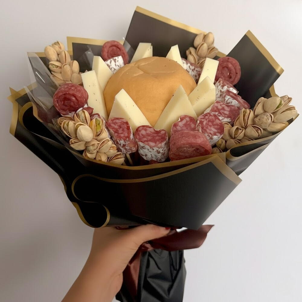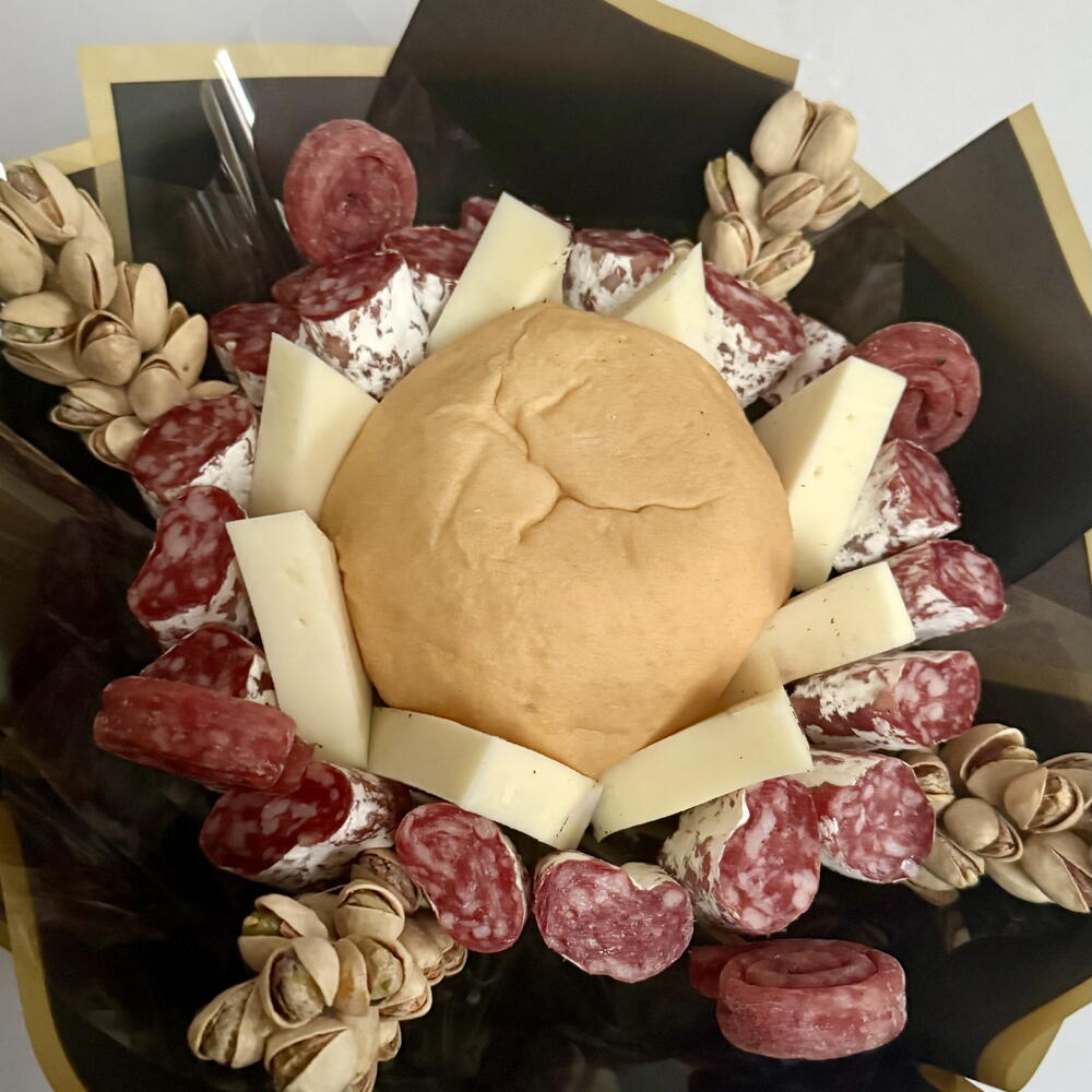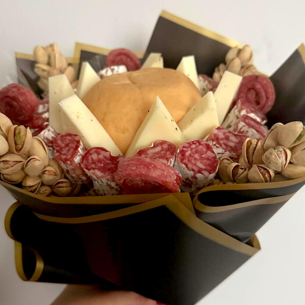 Este ramo sin gluten único destaca por su composición: incluye un exquisito pan sin gluten, un queso suavísimo de 200 gramos, aromático fuet en cantidad de 20 unidades, deliciosas cañitas de fuet —4 unidades— y lujosas Flores de pistacho —4 unidades—. La composición del ramo está creada para quienes valoran el verdadero sabor y la calidad; será el regalo ideal con estilo y confianza en sí mismo.