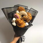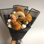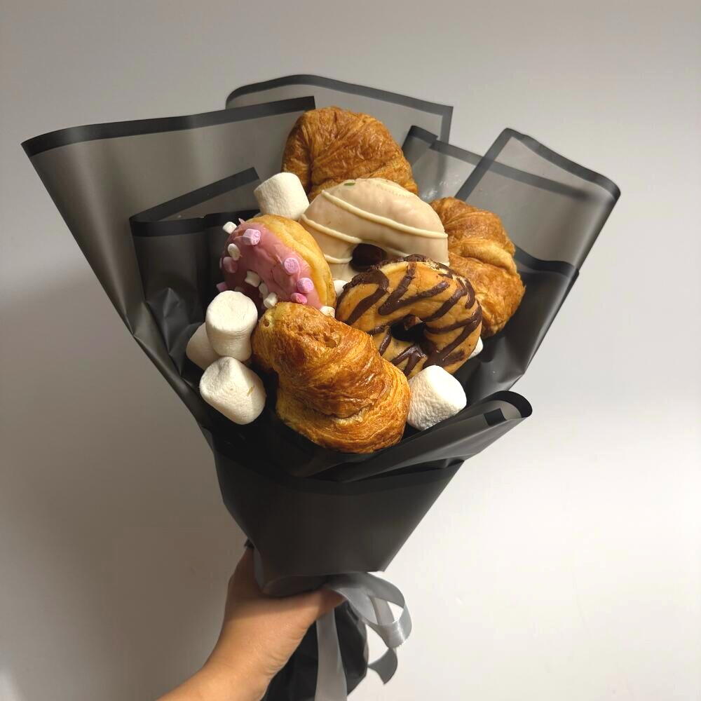 Este original ramo comestible combina la elegancia de un arreglo floral con el placer de los dulces recién horneados. Cruasanes dorados, donuts glaseados y suaves malvaviscos crean una composición irresistible que sorprende desde el primer vistazo. Su presentación moderna en envoltura negra resalta los tonos cálidos de la repostería, aportando un contraste sofisticado y atractivo. Es el regalo perfecto para cumpleaños, celebraciones o para endulzar un momento especial con un detalle fuera de lo común. Cada elemento está cuidadosamente dispuesto para mantener su frescura y su forma impecable. Recomendaciones de cuidado: conservar en un lugar fresco y seco, evitar la exposición directa al sol o al calor, consumir en un plazo de 24–48 horas para disfrutar su mejor sabor y textura.