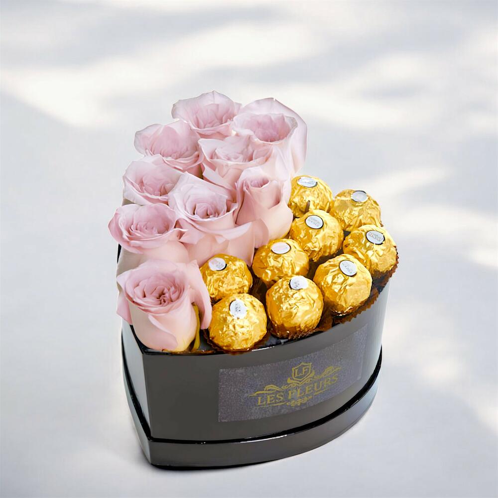 Deléitate con nuestro lujoso arreglo, una armoniosa combinación de elegantes rosas premium en tonos a elegir. Puedes personalizarlo eligiendo la cantidad de rosas y el color de la sofisticada caja en forma de corazón, disponible en negro o blanco. Presentadas con estilo, este conjunto exclusivo incluye irresistibles bombones de chocolate. Añade un toque de elegancia a tu espacio con este opulento arreglo, ideal para iluminar cualquier ocasión a lo largo del año y expresar tu amor de manera sofisticada.