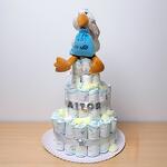 Classic diaper cake topped with a plush stork. It can be personalized with the baby's name. Can be made in blue or pink