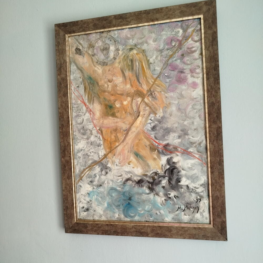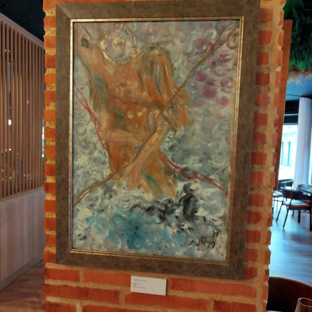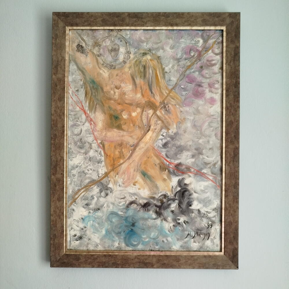 It is a semi-figurative oil painting, with abstract touches and impressionist brushwork. It depicts a couple, as the title suggests: a man and, behind him, a woman embracing his waist. You can see the woman's hair falling over his shoulder. The man's head has been replaced by a silver pendant consisting of an earring and a heart. A romantically inspired painting to decorate any space.