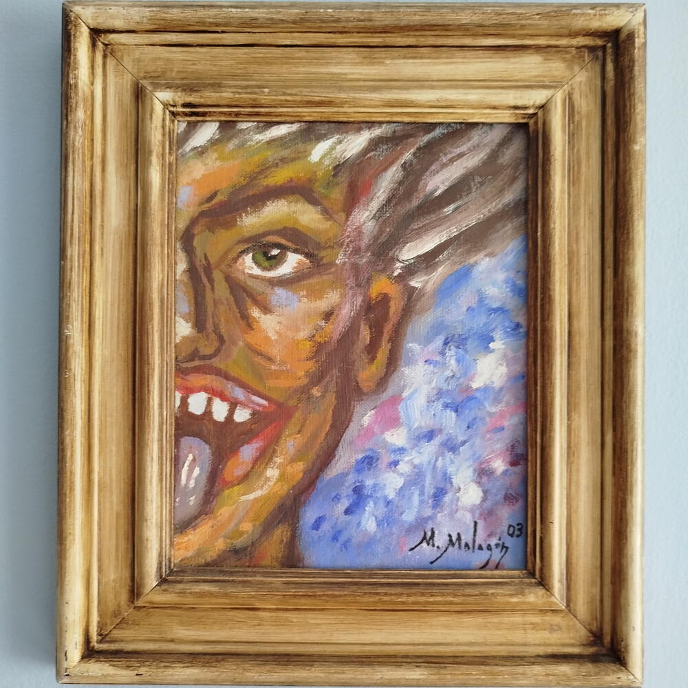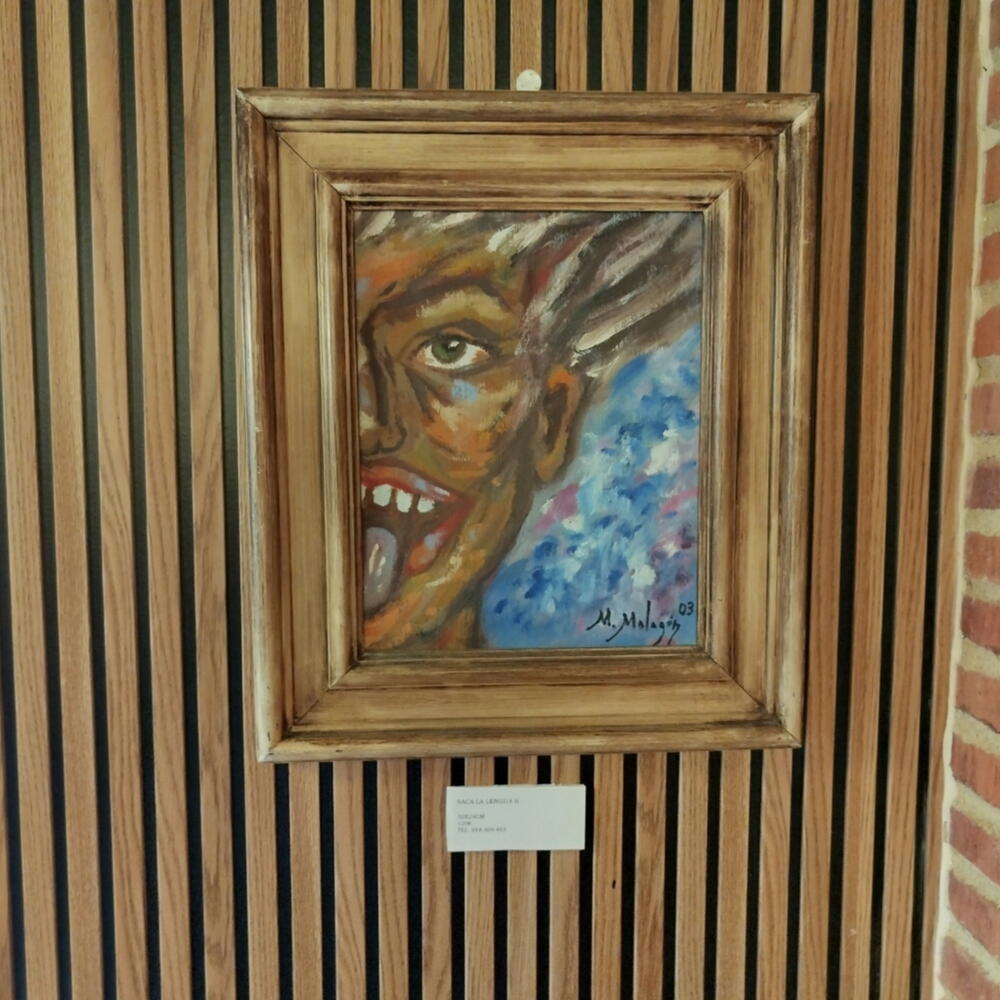 Oil on panel depicting half of a face sticking out its tongue. It is inspired by an old photograph of two people making the gesture of sticking out their tongues. It is ideal to be paired with its counterpart Saca la lengua I. Both paintings together, a short distance apart, are very decorative.