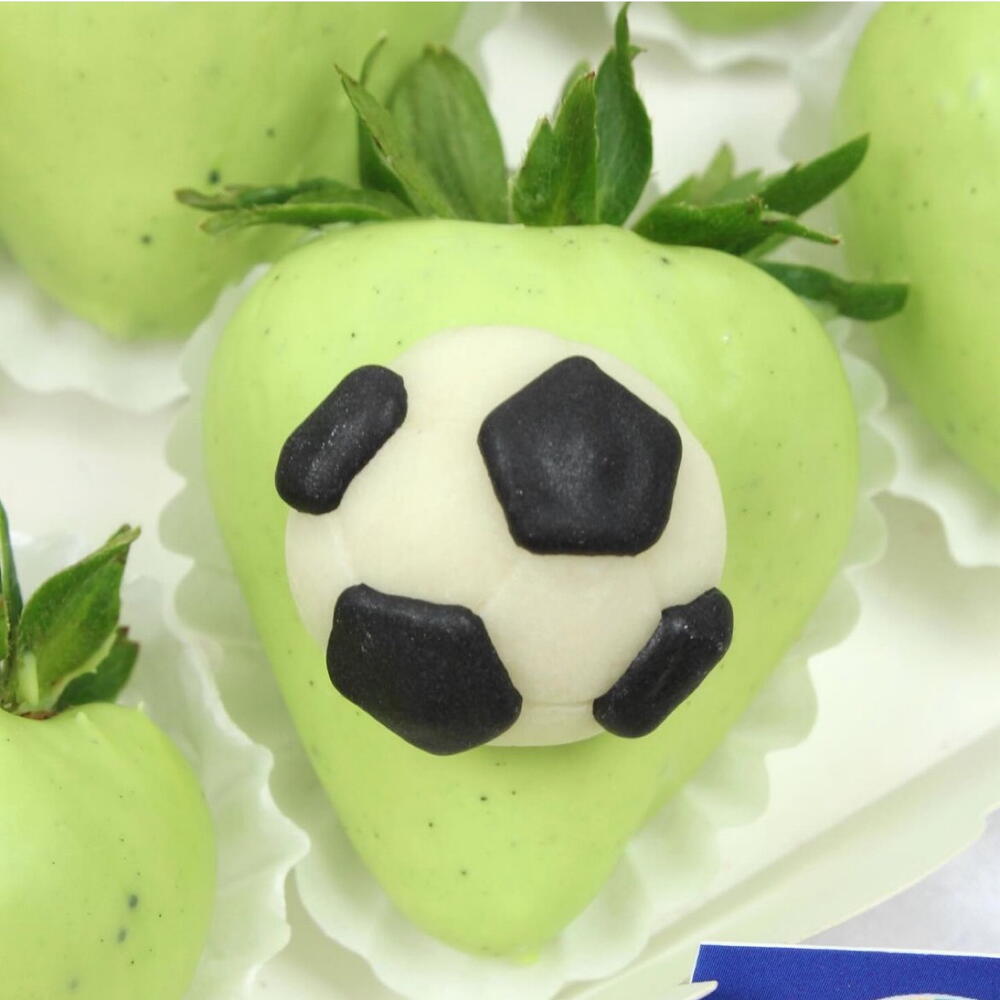 Estas deliciosas fresas con chocolate son el postre perfecto para los amantes del chocolate. Están recubiertas con chocolate blanco, que se compone de azúcar, manteca de cacao, leche entera en polvo, emulgente de lecitina de soja y un toque de vainilla natural para realzar el sabor. Además, están revestidas con un polvo verde encantador y decoradas con azúcar de balón de fútbol para darles un toque divertido. Todo ello hace que estas fresas con chocolate sean irresistibles y perfectas para compartir en cualquier ocasión.