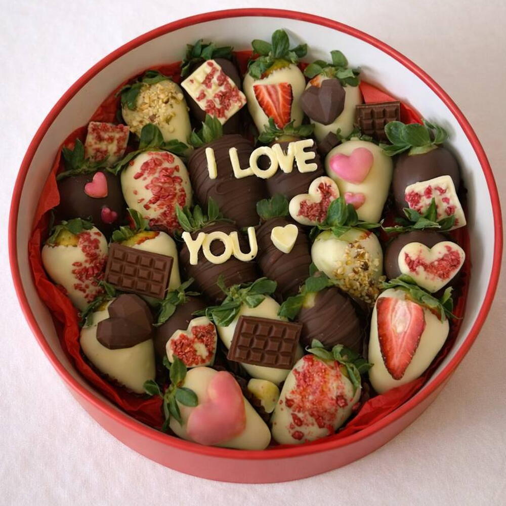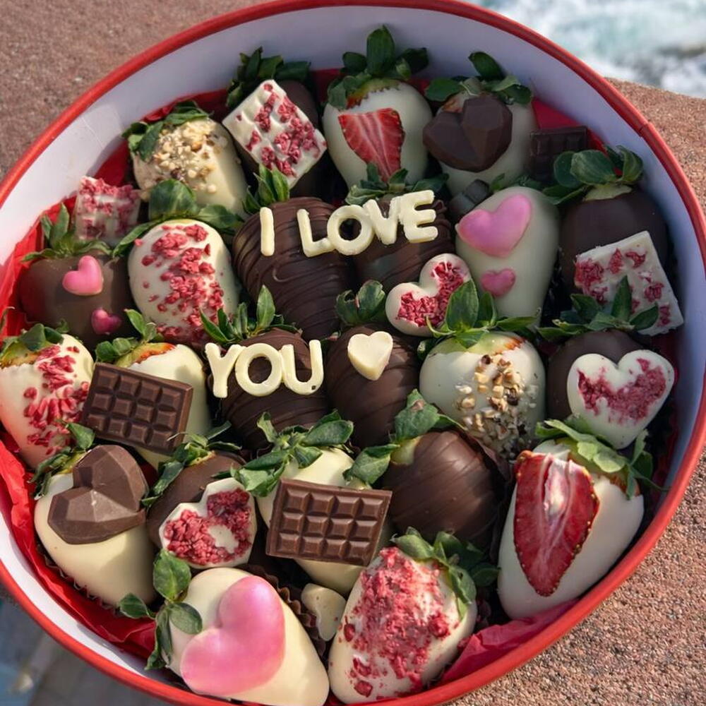 Classic, bold and versatile. The Berry I Love You Box mixes strawberries dipped in chocolate (white / milk / dark), with hearts and crunchy toppings, and the message I LOVE YOU in the center so there's no doubt. And yes: 100% customizable. We change the text, the colors, the decorative style and the theme according to your occasion: Valentine's Day, anniversary, proposal, birthday or "just because". Indicative quantity depending on size. And, of course, everything is gluten-free.