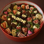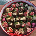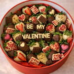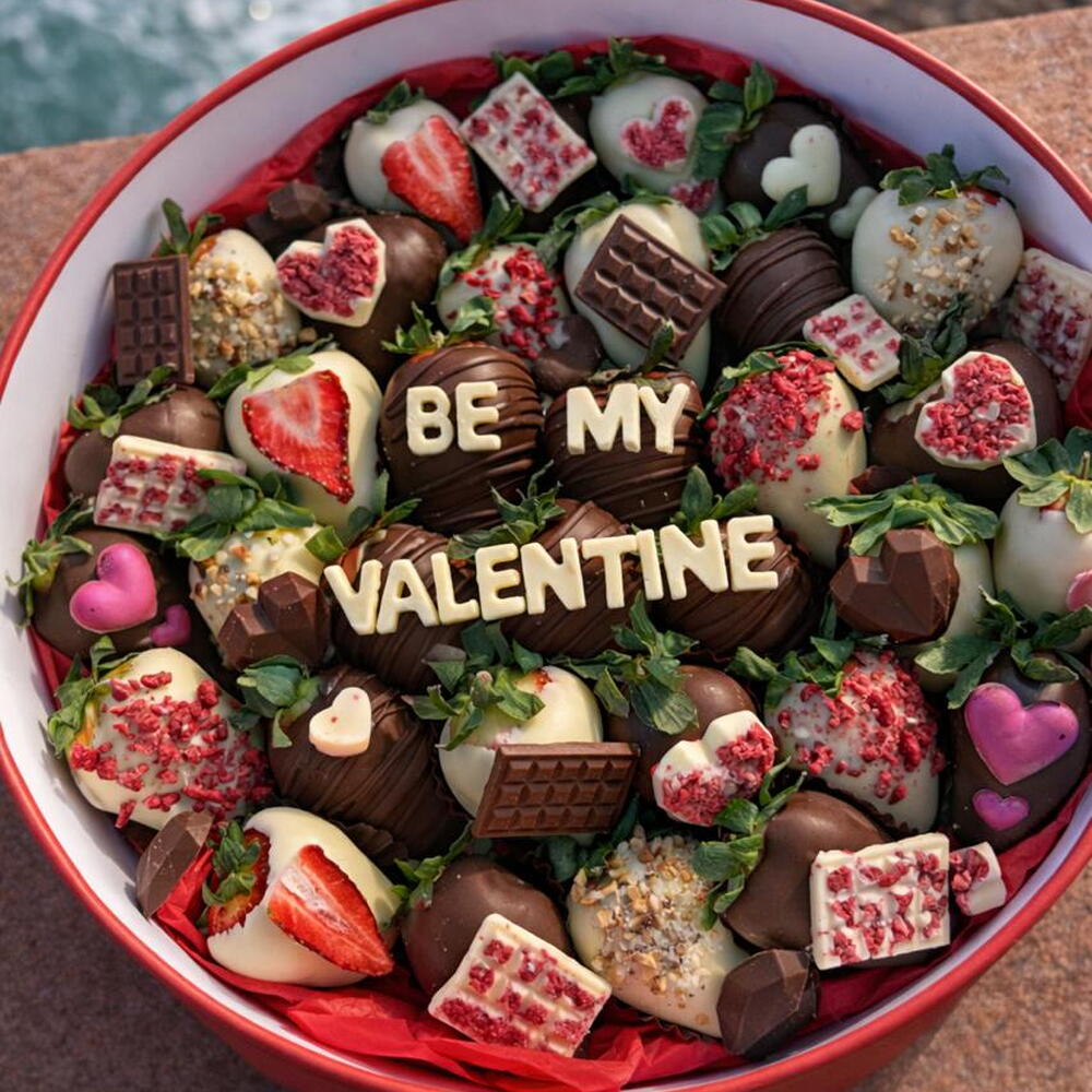 The box that seems like a "yes" before you even open it. The Berry Valentine Statement Box features the message "BE MY VALENTINE" in the center and an irresistible mix of chocolate-covered strawberries, heart-shaped decorations, chocolate pieces, and contrasting toppings. The best part: it's 100% customizable. You can change the message (name, initials, date, phrase), the color palette (classic red, pastel pink, black and gold, etc.), and the decoration style to perfectly match your story. And, of course, it's all gluten-free.