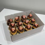 Heart-shaped chocoflan Soft, creamy and decorated with fresh strawberries The perfect dessert to say I love you in the sweetest way The quantity can be larger according to your preference. The price will vary depending on the requested quantity and the chosen design.