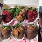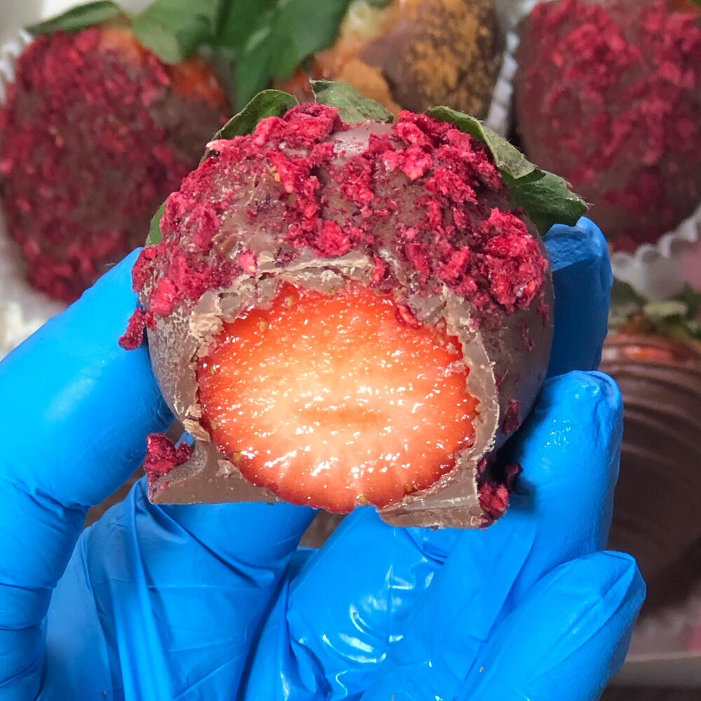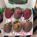 Delicious strawberries (large) covered with REAL CHOCOLATE, not a chocolate substitute. The box contains 6 pieces: - 2 milk chocolate strawberries (original) - 2 chocolate strawberries with Lotus cookies - 2 strawberries with pieces of dried raspberry. A delight!!!