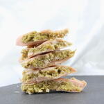 - Chocolate blanco (azúcar, manteca de cacao, LECHE entera en polvo, emulgente: lecitina de SOJA, aroma natural de vainilla) - Crema de pistacho (100%) - Kataifi (trigo y agua) Alérgenos: contiene gluten, leche y soja. Certificado Kosher y Halal.