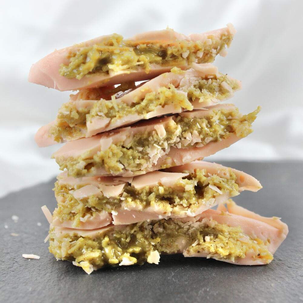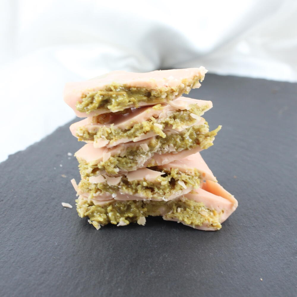 - Chocolate blanco (azúcar, manteca de cacao, LECHE entera en polvo, emulgente: lecitina de SOJA, aroma natural de vainilla) - Crema de pistacho (100%) - Kataifi (trigo y agua) Alérgenos: contiene gluten, leche y soja. Certificado Kosher y Halal.