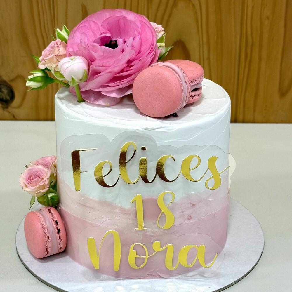 Birthday cake in white and pink tones, decorated with natural flowers and macarons. Its romantic decoration makes it the perfect choice for special celebrations.