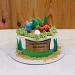 Children's cake decorated with a dinosaur theme, covered in shades of green and white with crushed cookie details simulating sand. On top it includes figures of dinosaurs, plants and an egg, creating a fun and colorful scene.