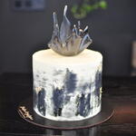 Modern cake with an artistic finish in black-and-white tones with a brushstroke effect, with gold leaf details that add a touch of luxury. On top, a large abstract decoration in glossy black with a ceramic effect stands out, simulating a splash frozen in mid-air. Elegant, contemporary design perfect for sophisticated celebrations.