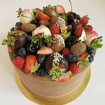 Spongy, soft chocolate sponge cake filled with chocolate ganache, covered on the outside with chocolate ganache (can be changed to dark chocolate), decorated with red berries, chocolate-covered strawberries and fresh strawberries, fresh blueberries, raspberries. Fruits may vary according to the season.