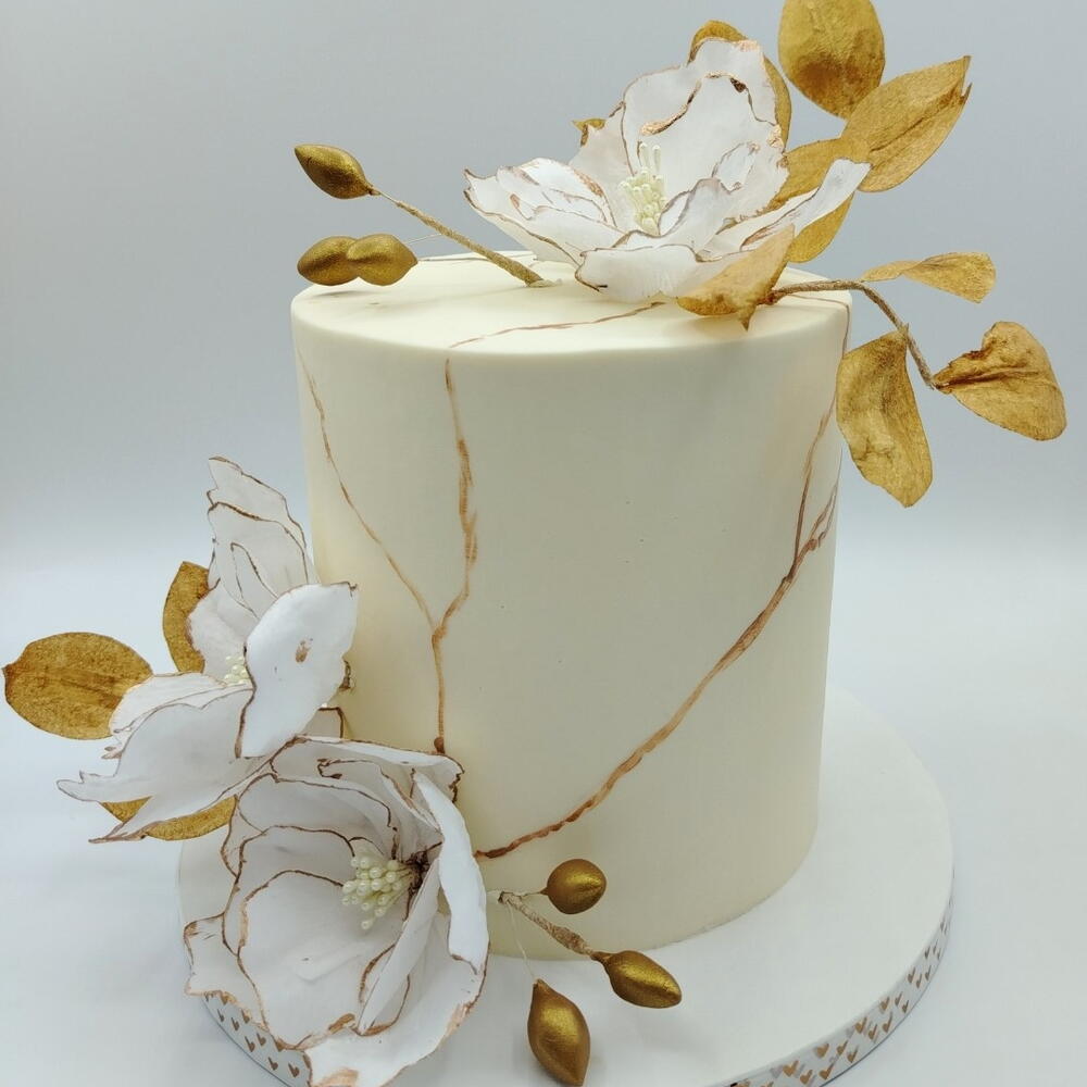 Cake for 20 servings, decorated with handmade rice paper flowers.