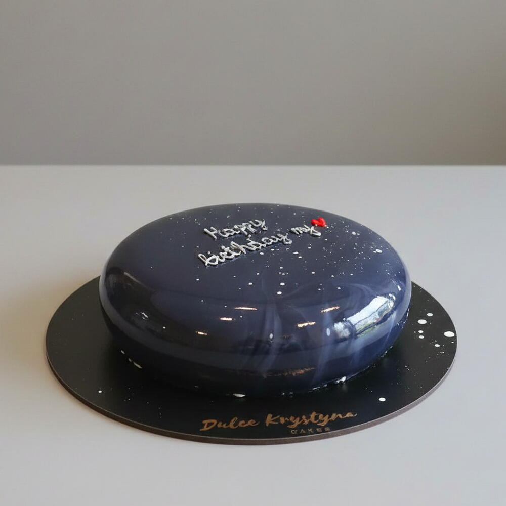 Mousse cake with a mirror glaze in dark blue and black tones, creating a starry-sky effect with white splashes and silver details. On top it features a personalized handwritten message and a small red heart. An elegant and modern design, perfect for birthdays and special celebrations.