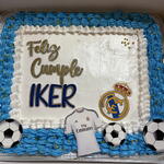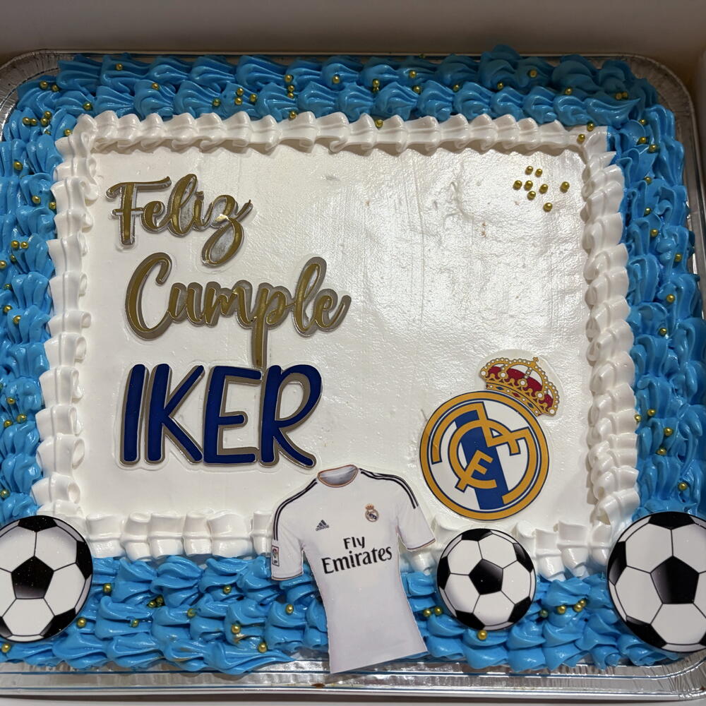 There's nothing like celebrating another year of life in the colors of the best team in the world. This personalized cake combines the elegance of white and gold with the vibrant blue of the merengue crest.