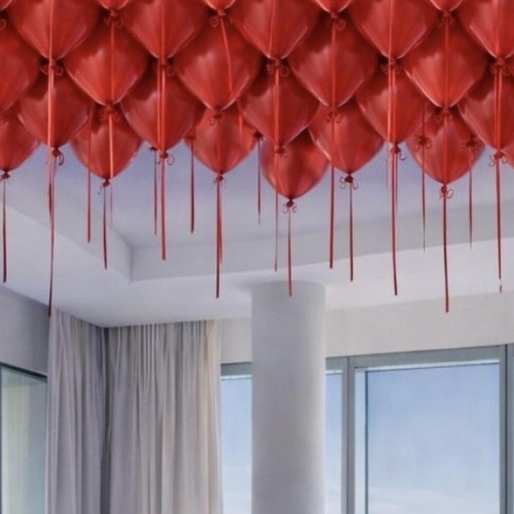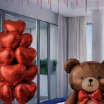 Hotel decoration for Valentine's Day •1 bear-shaped balloon, size 75*84 cm • 100 balloons for the ceiling, size 12’’ (30 cm), red • 2 bouquets of 16 heart-shaped balloons, size 18’’ (45 cm), red