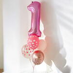 Celebrate the first birthday in a special way with this beautiful balloon set! 🎈 The set includes an impressive metallic number 1 balloon in bright pink, accompanied by round balloons with adorable cloud and heart designs. Perfect for festive decorations, photo sessions, or unforgettable parties, this arrangement adds a charming and colorful touch to any setting. The balloons are made from high-quality materials that ensure durability and shine throughout the celebration. Make this very special day even more magical with these joy-filled balloons! 🌸✨