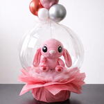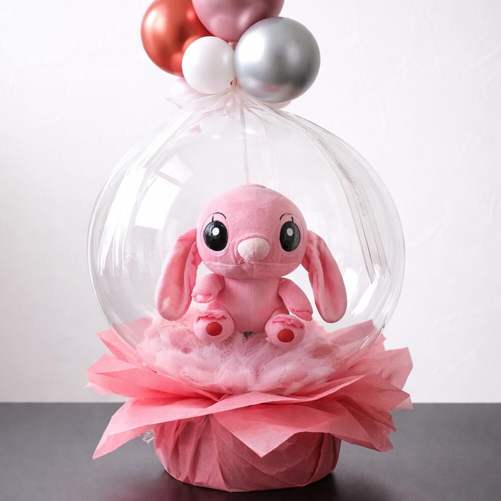 Cute Ángel Stich plush on a feather base with a beautiful matching balloon bow
