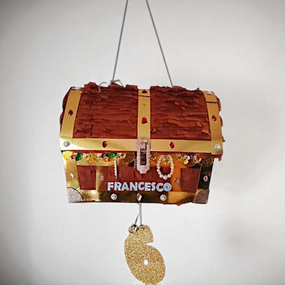 Discover the hidden treasure at your party with this incredible piñata shaped like a pirate chest! Perfect for themed birthdays, this piñata will make all the children feel like true explorers. Decorated with golden details and shiny "gems", it adds a touch of adventure and fantasy to any celebration. Its sturdy structure allows you to fill it with sweets, toys, or small treasures. To keep it in perfect condition, store it away from moisture and direct sunlight. Surprises and fun guaranteed with every hit! Personalized with name and age.