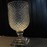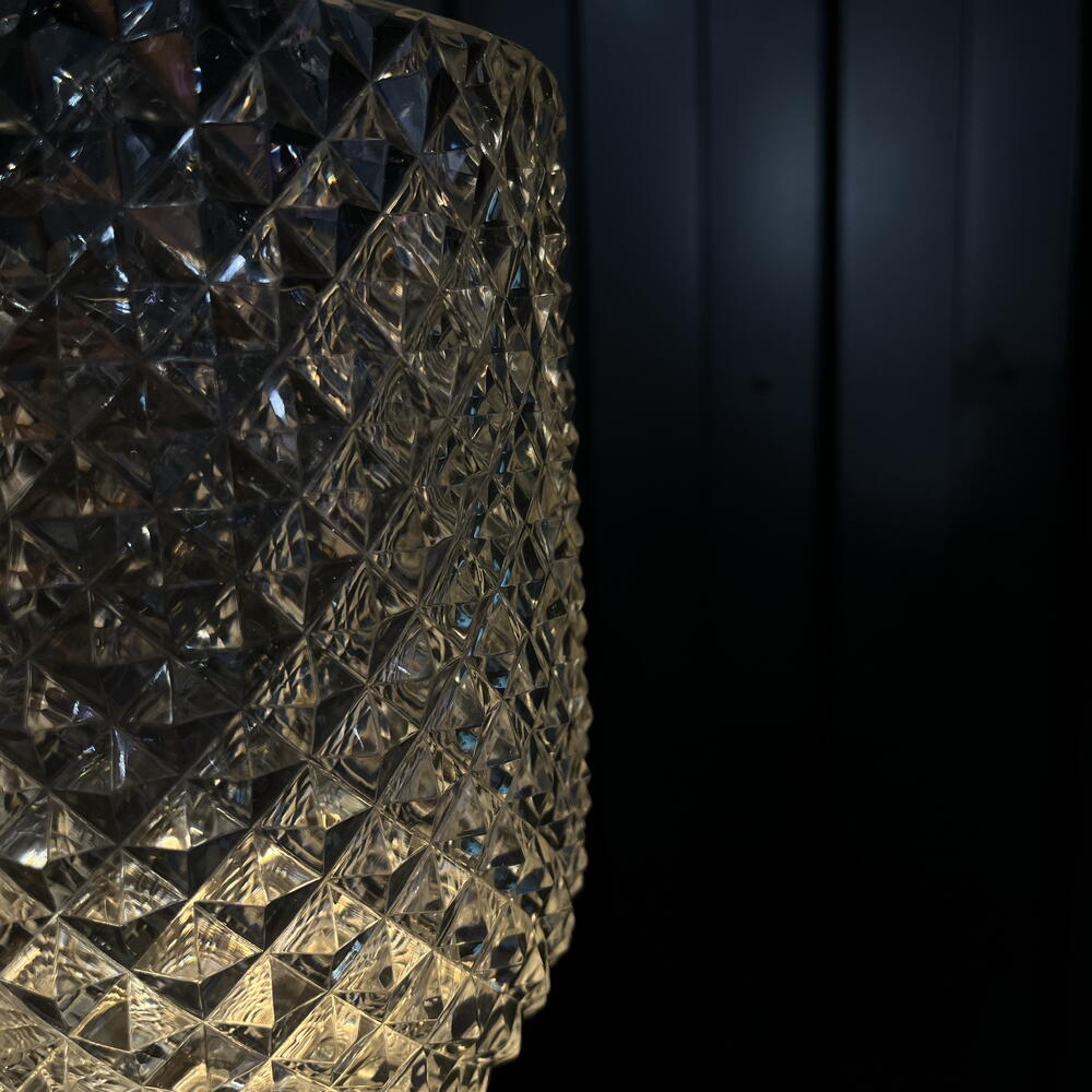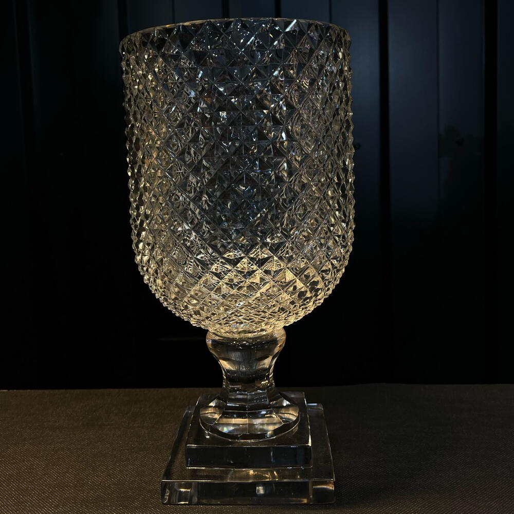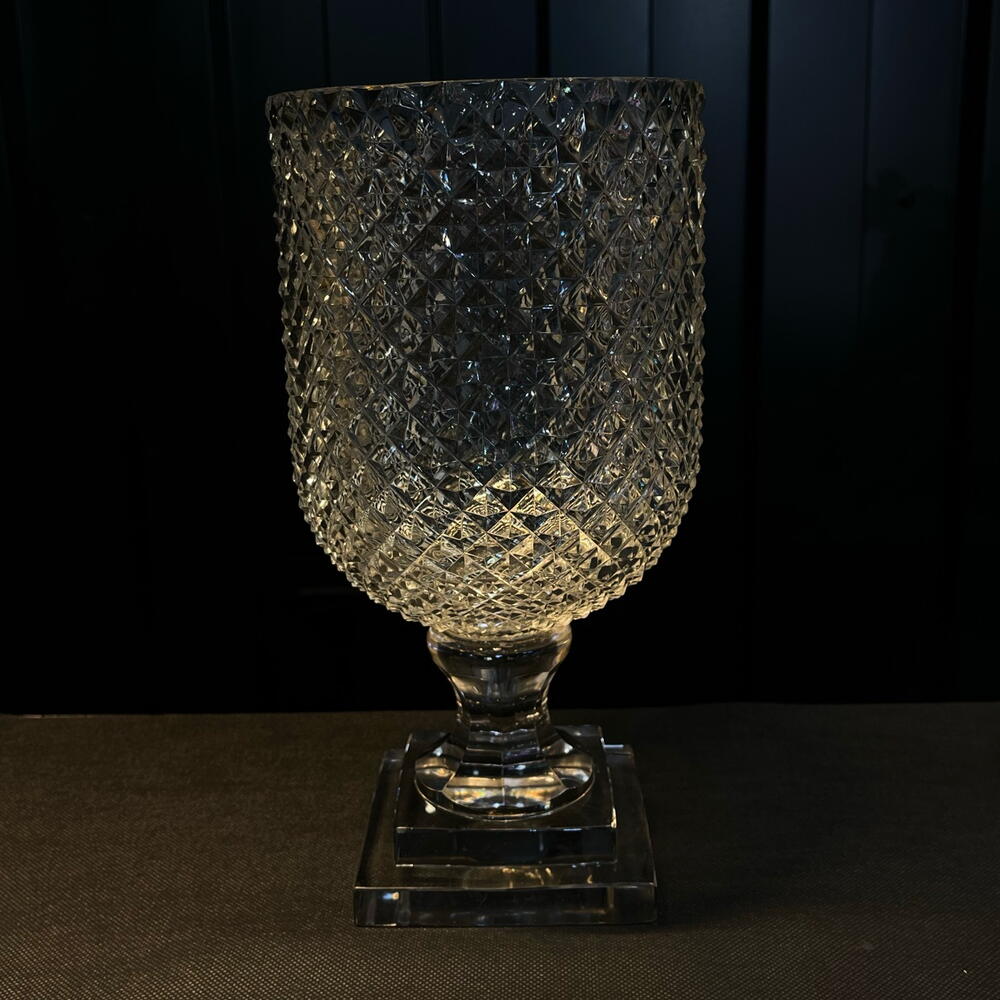 Un jarrón elegante y majestuoso: su cuerpo de vidrio transparente con corte diamante brilla como una joya, mientras que su base transparente lo eleva con un aire de sofisticación. Una pieza que combina lujo y modernidad en un solo diseño deslumbrante.