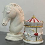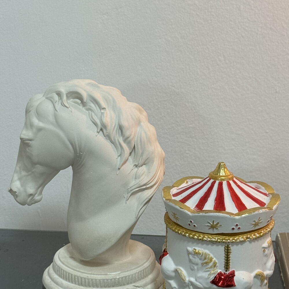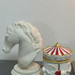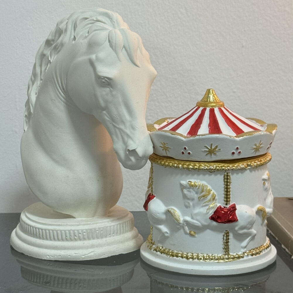 The set includes: • Horse head figurine — handmade in plaster, with a detailed and delicate finish. • Scented soy wax candle in a decorative carousel-shaped container. The candle burns evenly and safely, filling the space with a gentle scent and creating a warm atmosphere. Materials: plaster, soy wax, hand-painted. Perfect for the living room, bedroom, children's room, or as a Christmas decoration. An excellent idea as a gift or to create a festive atmosphere at home.