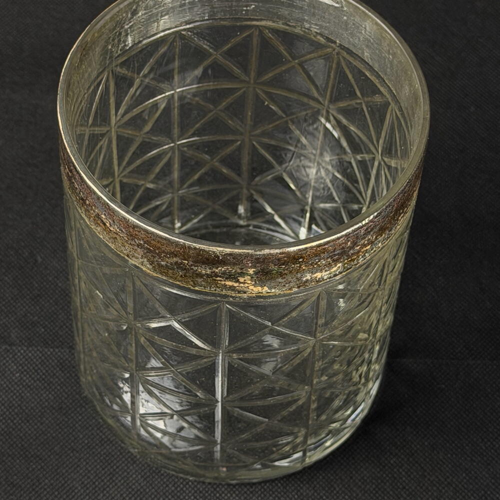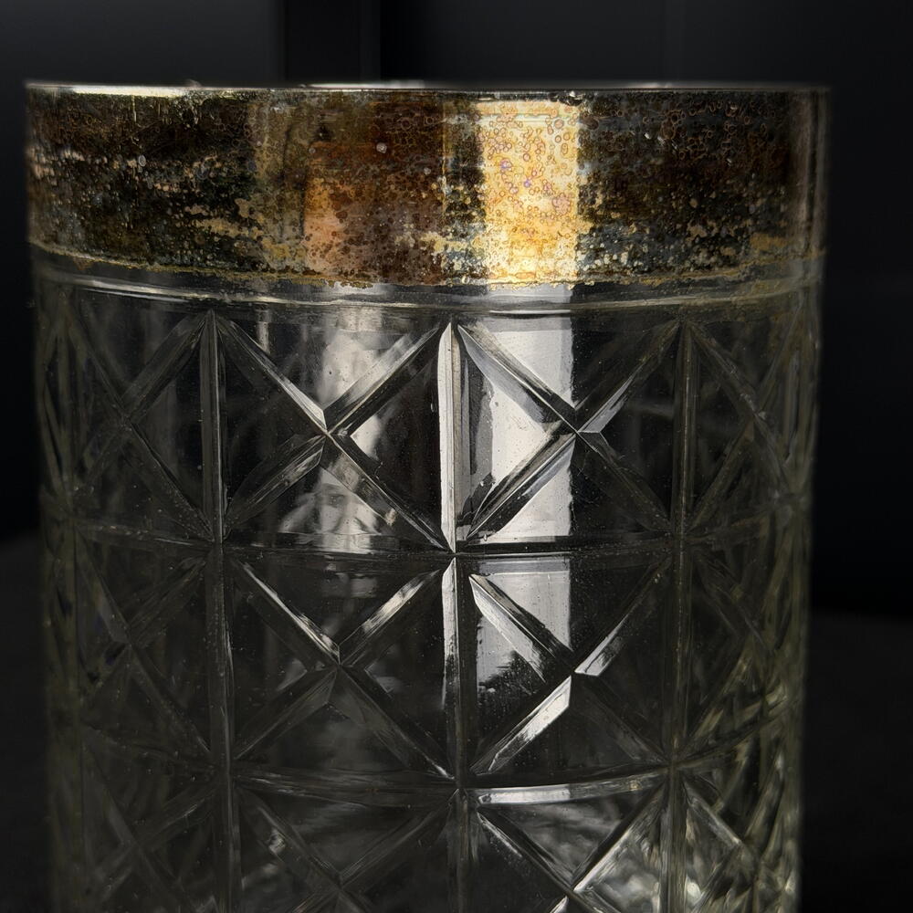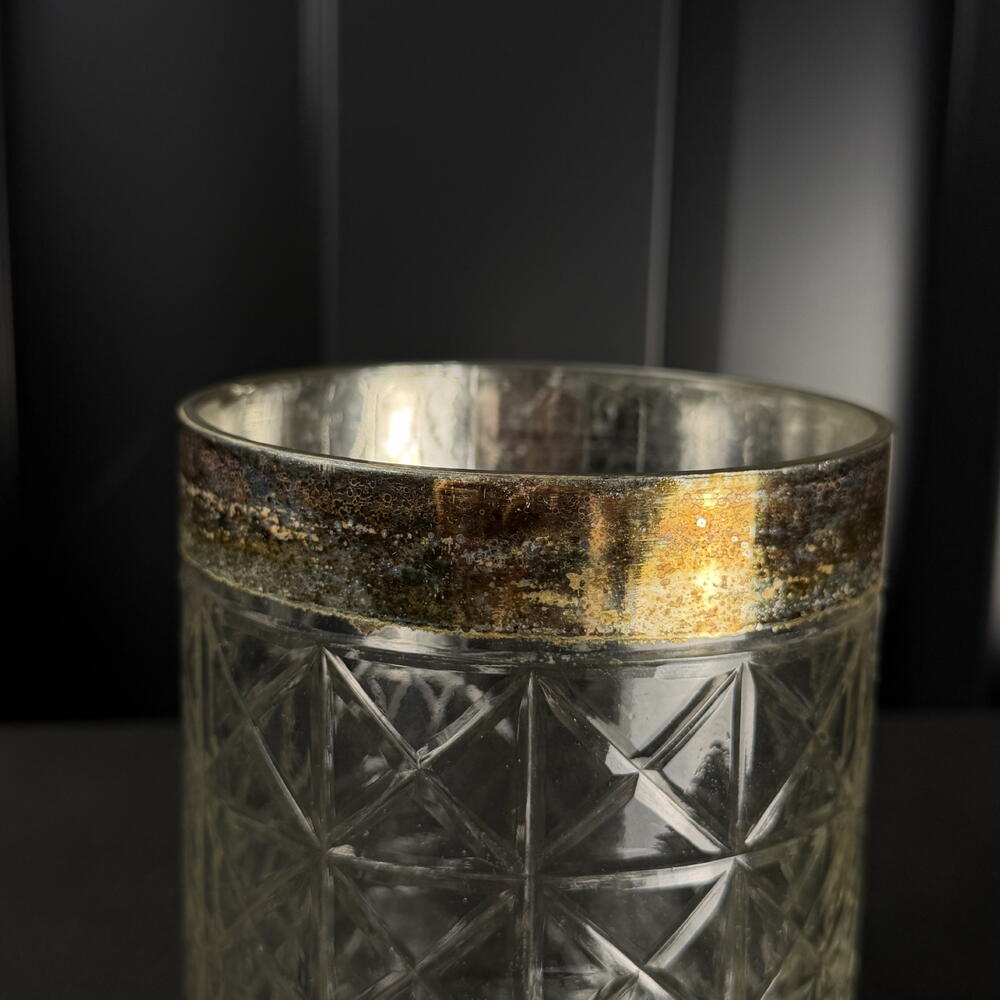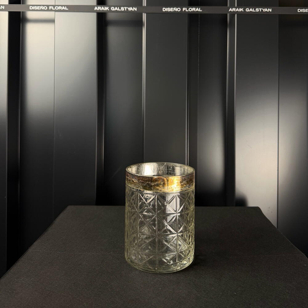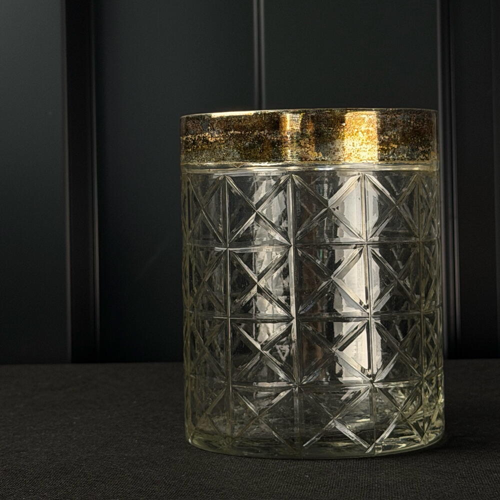 Ribbed glass vase with a gold rim, elegant and sophisticated, ideal for flowers, candles and interior decoration.