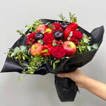 Un bouquet creativo y sorprendente que combina la elegancia de las flores con la frescura de frutas naturales. Las intensas rosas rojas aportan un toque romántico y sofisticado, mientras que las manzanas, ciruelas y pimientos rojos frescos crean una composición original y muy llamativa. El eucalipto y el follaje verde añaden textura, volumen y un aroma natural que equilibra perfectamente el arreglo. Esta combinación de flores y frutas reales convierte el bouquet en un regalo único, moderno y lleno de personalidad. Es ideal para sorprender en cumpleaños, celebraciones o como un detalle especial diferente a los ramos tradicionales. Para conservar el bouquet en buen estado, se recomienda colocar los tallos en agua fresca lo antes posible y cortar los tallos en diagonal antes de introducirlos en el agua. Cambiar el agua cada dos días ayudará a prolongar la vida de las flores. Mantener el ramo en un lugar fresco, lejos del sol directo y de fuentes de calor. Las frutas son naturales y frescas, por lo que se recomienda consumirlas en pocos días o retirarlas del arreglo cuando empiecen a madurar demasiado.