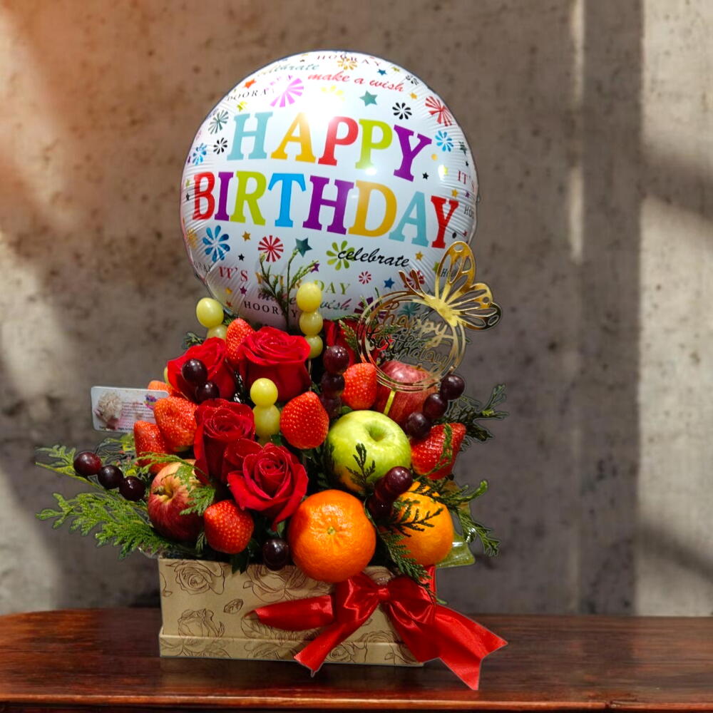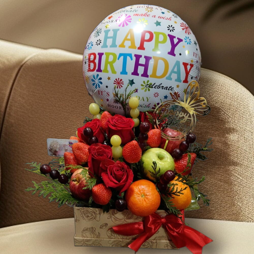This fascinating fruit bouquet is a perfect gift for any occasion. Presented in an attractive decorative box, it features a variety of fresh, healthy fruits such as strawberries (500gr), green and black grapes (200 gr each), two red apples, two mandarins, and decorative details such as two sparkling mosi, five red roses and four pieces of decorative foliage. The set is completed by a charming topper, an 18-inch balloon, a unique ornament and an elegant ribbon bow. This fruit bouquet is not only a feast for the eyes but also a true delight for the palate.