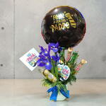 Give for Father's Day a delicate and sophisticated blue iris arrangement with two personalized Heineken beers themed for Father's Day, accompanied by a trio of Ferrero Rocher and two mini Twix chocolate bars, presented on a white ceramic base decorated with its ribbon bow and green foliage to highlight its elegance, and as a final touch a personalized 18-inch Father's Day balloon and a dedication card to express your feelings.