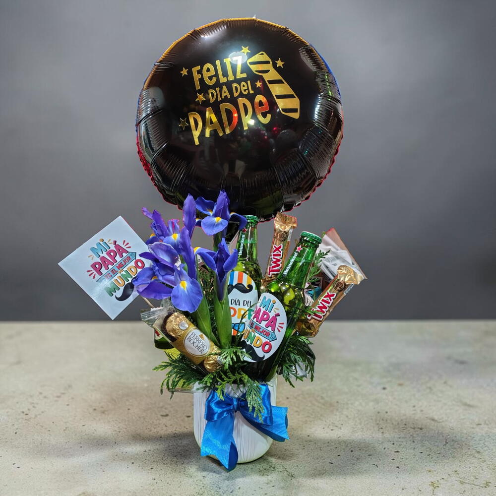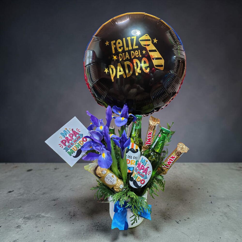 Give for Father's Day a delicate and sophisticated blue iris arrangement with two personalized Heineken beers themed for Father's Day, accompanied by a trio of Ferrero Rocher and two mini Twix chocolate bars, presented on a white ceramic base decorated with its ribbon bow and green foliage to highlight its elegance, and as a final touch a personalized 18-inch Father's Day balloon and a dedication card to express your feelings.