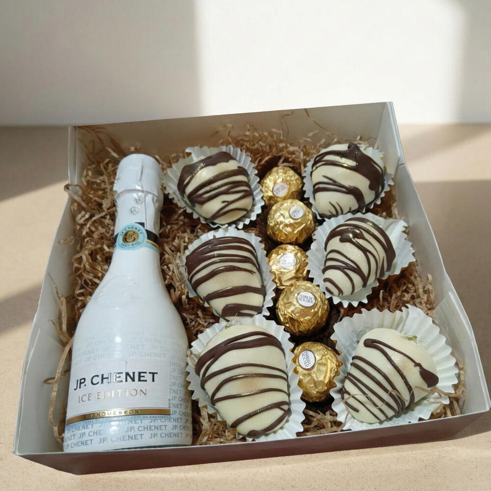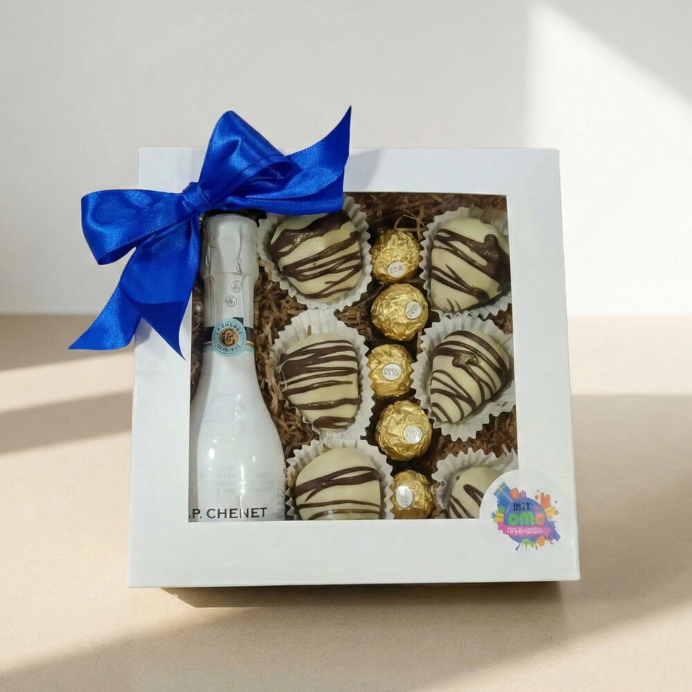 Surprise with this elegant gourmet box of chocolate-covered strawberries, perfect for gifting on special occasions such as birthdays, anniversaries or romantic celebrations. This exclusive gift combines fresh strawberries dipped in chocolate, Ferrero Rocher chocolates and a bottle of cava, creating a sweet and sophisticated experience. Presented in a decorative box with a satin ribbon, this premium gift stands out for its flavor, aesthetics and quality, ideal for expressing love, gratitude or congratulations in an unforgettable way.