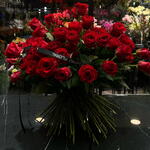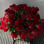 An imposing bouquet of 101 red roses, with long, perfectly aligned stems, conveying strength, passion and absolute elegance. The roses, in an intense, velvety red, form a generous and balanced volume, creating a rounded and very striking silhouette. The finish is clean and sophisticated, with the natural green of the foliage providing contrast and depth, and a black ribbon that reinforces its exclusive character. A classic and spectacular arrangement, designed to make an impact from the first moment and to express a deep, resounding message of love.